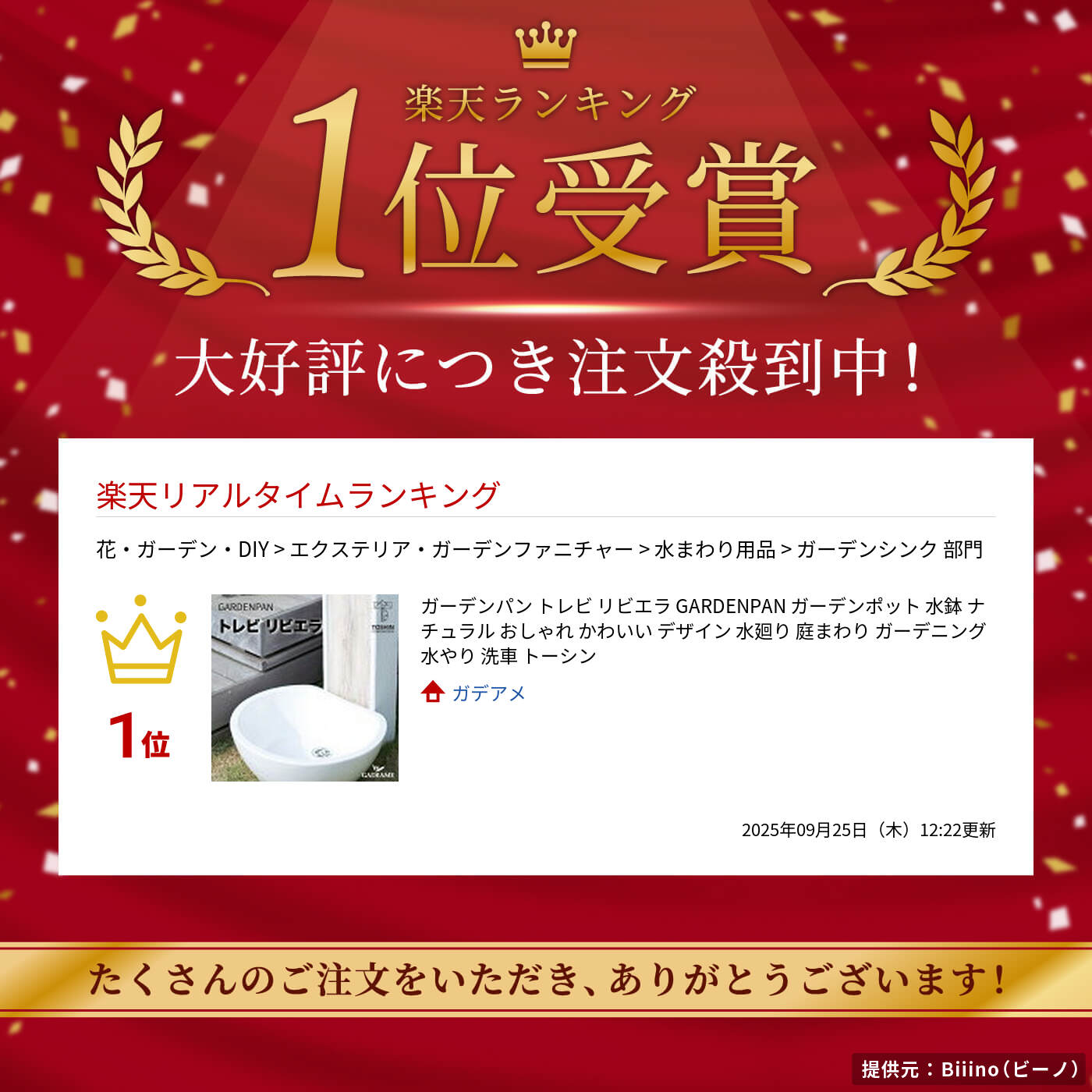 付属品排水用目皿、ゴム栓 ※樹脂製の排水口がついております。 ※水を溜める仕様にはなっておりませんのでご了承ください。備考同梱されているゴム栓は水を溜める為のものではなく下水道条例のガイドラインに沿って雨水の流入を防ぐ為の物です。 常時、水を溜めてのご使用は避けてください。 下水道条例のガイドラインに沿って降雨時にはゴム栓をご使用ください。 施工には、専門的な知識や技能が必要となりますのでお近くの施工業者様にご依頼ください。注意事項※こちらはメーカー直送品のため、代引きでのご注文はお受けしていません。 ※北海道・沖縄・離島・一部地域への発送には、追加料金がかかりますので、ご了承ください。お庭の立水栓と組み合わせて使えるガーデンパンカラーは2色からお選びいただけます。商品の施工イメージ商品について当店で販売中のトレビリビエラのセット商品はこちらから。 関連商品はこちらガーデンパン トレビ リビエラ GARDENP...16,380円【パン・上下蛇口セット】立水栓 アーバ...63,200円【蛇口+選べるパンセット】立水栓 エー...43,500円~[パン・蛇口2個セット]立水栓 アン ポッ...55,800円[6点セット] 水栓ユニット un ティーラ ...176,800円