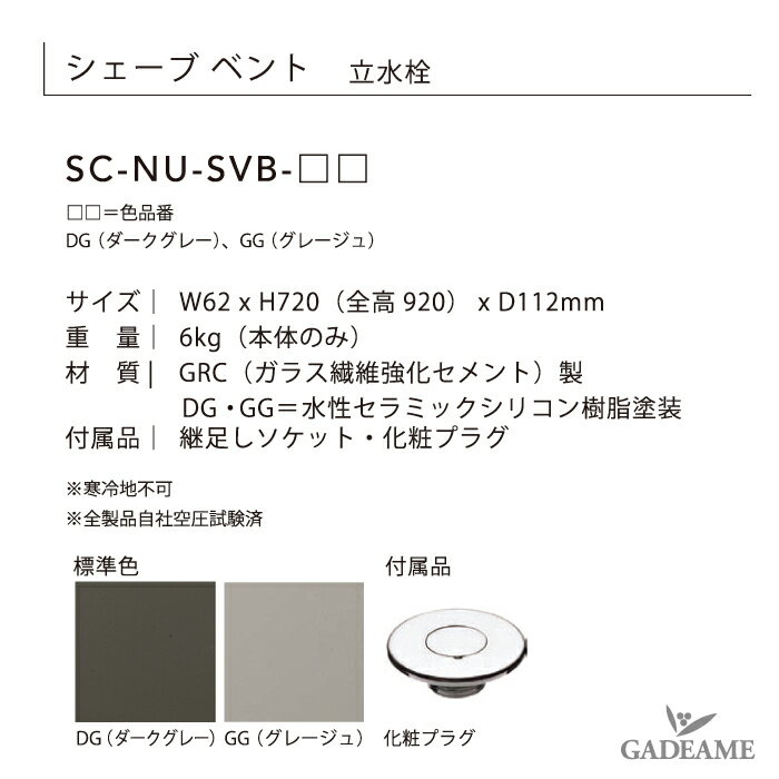 付属品化粧プラグ、排水用目皿、ゴム栓(シェーブワイドのみ) ※樹脂製の排水口がついております。 ※水を溜める仕様にはなっておりませんのでご了承ください。備考シェーブワイドに同梱されているゴム栓は水を溜める為のものではなく下水道条例のガイドラインに沿って雨水の流入を防ぐ為の物です。 常時、水を溜めてのご使用は避けてください。 下水道条例のガイドラインに沿って降雨時にはゴム栓をご使用ください。 施工には、専門的な知識や技能が必要となりますのでお近くの施工業者様にご依頼ください。注意事項※こちらはメーカー直送品のため、代引きでのご注文はお受けしていません。 ※北海道・沖縄・離島・一部地域への発送には、追加料金がかかりますので、ご了承ください。2025年新商品!正面に屈曲した形状なので蛇口下のスペースを広く使用できます。シェーブベントのスペックです上下の蛇口をセットにしてお届けいたします。 蛇口上部:JA-MV-K13-BZ 蛇口下部:JA-MV-G30ABZ水栓柱のみ(蛇口付き)のご購入もできますが、ガーデンパンとのセット商品もご用意しています。こちらはシェーブベント×シェーブレクトの施工図となります。八角形の美しさが映える、水まわりの新しいかたち。セットのガーデンパンはシェーブワイドとシェーブレクトからお選びいただけます。ガーデンパンについて 関連商品はこちら[パン・蛇口2個セット]立水栓 アン ポッ...[蛇口+パンセット]立水栓 コルム 水栓柱...【パン・上下蛇口セット】立水栓 アーバ...【木目カラーをリニューアル】[7点セッ...【パン・上下蛇口セット】立水栓 アーバ...