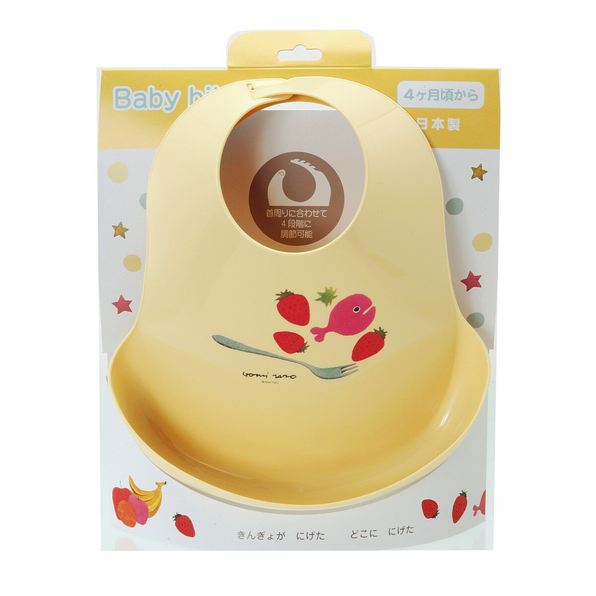 商品説明五味太郎さんの人気絵本「きんぎょがにげた」のキュートなデザインの、軽くて丈夫な子供用お食事シリーズは、離乳食時期の赤ちゃんから長く使っていただけます。きんぎょのチャーミングなデザインがかわいい、生後4か月頃から離乳食時期にお使いいただける食事エプロン!お食事タイムの必需品の食事エプロンは、離乳食をはじめた赤ちゃんの楽しいお食事タイムをサポートします。凹凸に引っ掛けるだけで簡単に着脱できて、お子さまの成長にあわせて首周りが4段階に調節可能です。大きく開いたポケットですかさずキャッチ、食べこぼしをしっかりガードします。柔らかいポリエチレン素材のエプロンはポケットにキャッチした食べ物が滲みない防水タイプ。使い終わった後はさっと洗ってお手入れ簡単です。※食洗機は使用できません。内容量1個素材・材質ポリエチレンサイズ幅220×高さ290×幅77mm重量75g生産国日本商品名G/T食事エプロン (きいろ) K08050 学研ステイフル