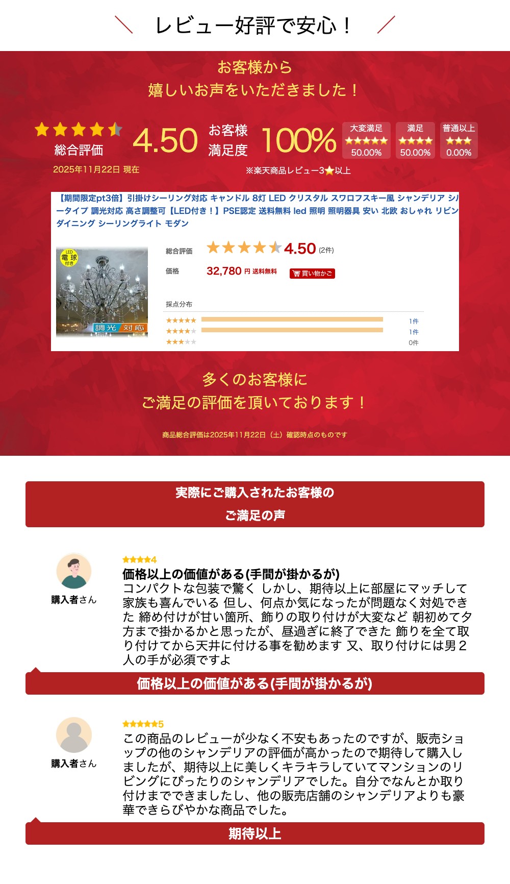 商品説明 ☆LED電球サービスキャンペーン実施中!☆☆キャンドル型広角LED電球8灯(¥9600-相当)をお付けさせて頂き驚きのプライス!【送料無料】新品 キャンドル8灯 豪華 クリスタルシャンデリア シンプルデザイン LEDシーリングタイプ ☆上質水晶ならではの最高の輝きを放つ新品クリスタルシャンデリア☆添付画像では肉眼で見る本来のクリスタルの輝きをご確認いただけませんが、8灯の電球が上質クリスタル水晶を通し光の屈折で光の持つ本来のカラーをかもし出しダイヤモンドのように輝きながらワット数以上の明るさでお部屋を照らします♪☆シャンデリア本体は調光にも対応しておりお好みの明るさに調整可能です※調光が必要の場合、調光対応LED1個別途¥200-と汎用調光器が必要です ☆付属電球・・・口金E17キャンドル型広角LED 白色又は暖色(明るさ40ワット消費電力4ワット 暖色110Lm/W・白色130Lm/W)☆ご希望のLED電球をお申し付けください☆商品画像は白色LEDを装着し撮影しております☆シャンデリア本体は調光にも対応しており調光スイッチでお好みの明るさに調整可能です※調光ご希望の場合は調光対応LED(1個¥200-アップ)と汎用調光器が必要です☆取り付けに関しましてはワンタッチでは御座いませんが(配線はワンタッチ)引掛けシーリングに対応しております☆キャンドル8灯 豪華 シンプルデザイン クリスタルシャンデリアを是非この機会に! サイズ 高さ(天井よりシャンデリア本体底辺)約55〜115cm調整可能 直径約75cm 重量約7キロ 送料 ■送料無料(沖縄・北海道別途¥800-) ご注意 新品・未使用品での販売ですが製造上での多少の小傷等はご了承願います 取り付けに関しましてはワンタッチでは御座いませんが(配線はワンタッチ)引掛けシーリングに対応しております、取り付け説明を参考に組み立て・結線して下さい、ご心配の場合は安全を期して最寄の電気工事店にご依頼をお勧めいたします また取り付け方等事前にお知りになりたい方はお気軽に質問コーナー又はfirst@kuk.ne.jpにお問い合わせお願い致します 調光が必要の場合、調光対応LED1個別途¥200-と汎用調光器が必要です 店頭販売もしており重複した場合キャンセルさせていただく場合がございますがあらかじめご了承願います 関連商品【期間限定pt3倍】クリスタル シャンデリア LED 9灯 調光可能 ...【期間限定pt3倍】綺麗なデザイン LED ダウンライト 10灯 リモ...【期間限定pt3倍】 【LED付き!】引掛けシーリング対応 キャンド...32,780円32,780円32,780円【期間限定pt3倍】 【LED付き!】引掛けシーリング対応 キャンド...【期間限定pt3倍】【LED付き!】1年保証 シャンデリア LED 8...【期間限定pt3倍】引掛シーリング対応 キャンドル 6灯 LED ク...32,780円32,780円29,480円【期間限定pt3倍】引掛シーリング対応 キャンドル 8灯 LED ク...【期間限定pt3倍】引掛シーリング対応 キャンドル 6灯 LED ク...【期間限定pt3倍】粋なデザイン LED ダウンライト 9灯 スワロフ...32,780円29,480円32,780円キャンドル8灯クリスタルシャンデリア ☆LED電球サービスキャンペーン実施中!☆☆キャンドル型広角LED電球8灯(¥9600-相当)をお付けさせて頂き驚きのプライス!【送料無料】新品 キャンドル8灯 豪華 クリスタルシャンデリア シンプルデザイン LEDシーリングタイプ 飽きの来ないシンプルなデザイン ☆上質水晶ならではの最高の輝きを放つ新品クリスタルシャンデリア☆添付画像では肉眼で見る本来のクリスタルの輝きをご確認いただけませんが、8灯の電球が上質クリスタル水晶を通し光の屈折で光の持つ本来のカラーをかもし出しダイヤモンドのように輝きながらワット数以上の明るさでお部屋を照らします♪☆シャンデリア本体は調光にも対応しておりお好みの明るさに調整可能です※調光が必要の場合、調光対応LED1個別途¥200-と汎用調光器が必要です インテリアとしても最適です! ☆付属電球・・・口金E17キャンドル型広角LED 白色又は暖色(明るさ40ワット消費電力4ワット 暖色110Lm/W・白色130Lm/W)☆ご希望のLED電球をお申し付けください☆商品画像は白色LEDを装着し撮影しております☆シャンデリア本体は調光にも対応しており調光スイッチでお好みの明るさに調整可能です※調光ご希望の場合は調光対応LED(1個¥200-アップ)と汎用調光器が必要です☆取り付けに関しましてはワンタッチでは御座いませんが(配線はワンタッチ)引掛けシーリングに対応しております☆キャンドル8灯 豪華 シンプルデザイン クリスタルシャンデリアを是非この機会に! サイズ 高さ(天井よりシャンデリア本体底辺)約55〜115cm調整可能 直径約75cm 重量約7キロ 送料 ■送料無料(沖縄・北海道別途¥800-) 注意事項 新品・未使用品での販売ですが製造上での多少の小傷等はご了承願います 取り付けに関しましてはワンタッチでは御座いませんが(配線はワンタッチ)引掛けシーリングに対応しております、取り付け説明を参考に組み立て・結線して下さい、ご心配の場合は安全を期して最寄の電気工事店にご依頼をお勧めいたします また取り付け方等