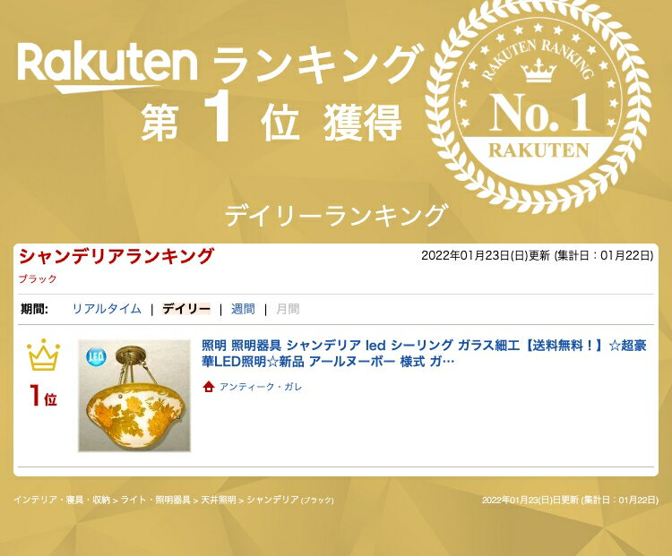 商品説明 20%OFF【今月の超お買い得商品!】現行販売価格¥32780-のガレ風シャンデリアをセール価格でご提供! 【送料無料!】★超豪華LED照明★新品・アールヌーボー様式ガレ風ガラス工芸アンティークシャンデリア☆広角LED4灯(6000-相当)をお付けいたしまして驚きのプライス!☆エミール・ガレの名はアール・ヌーボーの代表的な担い手として一躍有名になり彼の様々な技法を駆使して生み出される神秘的なガラス工芸品の数々は美術的に高く評価されましたそれらの技法は熟練した職人の手により今日に受け継がれガレ風の作品として、すべて手作りで作り続けられています☆今回のシャンデリアはその中の被せガラス技法で作られた作品です被せガラスとは何種類もの色ガラスを重ね着させ、その後に表面から彫刻を施し深く彫る事により下の色が現れ変化にとんだ模様を出すことができます重ね具合や厚さにより同じガラスでもまったく別の雰囲気になります ☆実物は写真で見るより数段すばらしく、インテリアとしての色調と電気をつけたときのうっとりするような美しい色調の両方をご堪能いただけます☆シャンデリア本体は調光にも対応しておりライトコントロールスイッチでお好みの明るさに調整可能です※調光ご希望の場合は調光対応LED(1個¥200-アップ)と汎用調光器(Panasonic製LED用調光器推奨)が必要です☆高級感あふれるガラス工芸シャンデリアを是非この機会に!お部屋のムードが一変します。☆大手家具メーカー・専門量販店等で数十万で販売されているシャンデリアと同等商品です ☆付属電球・・・口金E26 広角LED 白色又は暖色 4個(明るさ40ワット消費電力4ワット・暖色110Lm/W・白色130Lm/W)☆ご希望のLED電球をお申し付けください☆商品画像は暖色LEDを装着し撮影しております※調光ご希望の場合は調光対応LED(1個¥200-アップ)と汎用調光器(Panasonic製LED用調光器推奨)が必要です☆取り付けに関しましては引掛けシーリングに対応しております☆超豪華ガレ風ガラス工芸アンティークシャンデリアを是非この機会に! サイズ 直径41センチ 天井より下に約43センチ 重量約3〜4キロ 送料 ■送料無料(沖縄・北海道別途¥800-) ご注意 新品・未使用品での販売ですが製造上での多少の小傷等はご了承願います 職人による手作り被せガラス手法での作品で製造時に生じる凹凸・気泡・細かい異物混入又画像と色目の濃淡等若干違う場合がございます、重量に関しましても手作りでの作品でガラスの厚み等で若干の違いが生じます以上ご了承の上ご注文願います取り付けに関しましては引掛けシーリングに対応しております 調光ご希望の場合は調光対応LED(1個¥200-アップ)と汎用調光器が必要です調光非対応LED電球使用時、壁スイッチが調光スイッチ又はホタルスイッチの場合はLED不具合の原因になりますのでON/OFFのみのスイッチでご使用願います店頭販売もしており重複した場合キャンセルさせていただく場合がございますがあらかじめご了承願います 関連商品20%OFF【今月の超お買い得商品!】現行販売価格¥32780-のガレ...【期間限定pt3倍】 シャンデリア ペンダントライト led 照明 照...【期間限定pt3倍】粋なデザイン LED内蔵 シーリングライト リモコ...26,224円26,180円27,280円【期間限定pt3倍】キャンドル 8灯 シャンデリア LED 引掛けシー...【期間限定pt3倍】 1年保証 シャンデリア 7灯 可愛いデザイン 薔...【期間限定pt3倍】 吹き抜けに最適! 上質クリスタルの輝き LED ...27,280円27,280円25,080円【期間限定pt3倍】引掛けシーリング対応 キャンドル 6灯 ブラック...【期間限定pt3倍】 引掛けシーリング対応 可愛いデザイン 薔薇モチー...【期間限定pt3倍】 キャンドル 6灯 ブラック クリスタル LED ...27,390円27,280円27,390円ガレ風ガラス工芸アンティークシャンデリア 20%OFF【今月の超お買い得商品!】現行販売価格¥32780-のガレ風シャンデリアをセール価格でご提供! 【送料無料!】★超豪華LED照明★新品・アールヌーボー様式ガレ風ガラス工芸アンティークシャンデリア☆広角LED4灯(6000-相当)をお付けいたしまして驚きのプライス!☆エミール・ガレの名はアール・ヌーボーの代表的な担い手として一躍有名になり彼の様々な技法を駆使して生み出される神秘的なガラス工芸品の数々は美術的に高く評価されましたそれらの技法は熟練した職人の手により今日に受け継がれガレ風の作品として、すべて手作りで作り続けられています☆今回のシャンデリアはその中の被せガラス技法で作られた作品です被せガラスとは何種類もの色ガラスを重ね着させ、その後に表面から彫刻を施し深く彫る事により下の色が現れ変化にとんだ模様を出すことができます重ね具合や厚さにより同じガラスでもまったく別の雰囲気になります 被せガラス技法で作られた作品 ☆実物は写真で見るより数段すばらしく、インテリアとしての色調と電気をつけたときのうっとりするような美しい色調の両方をご堪能いただけます☆シャンデリア本体は調光にも対応しておりライトコントロールス