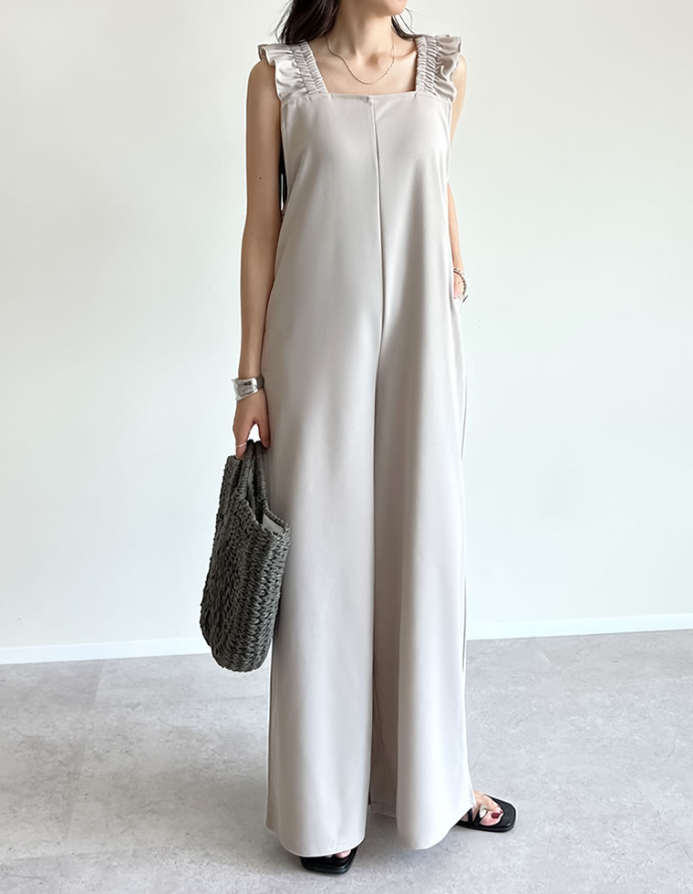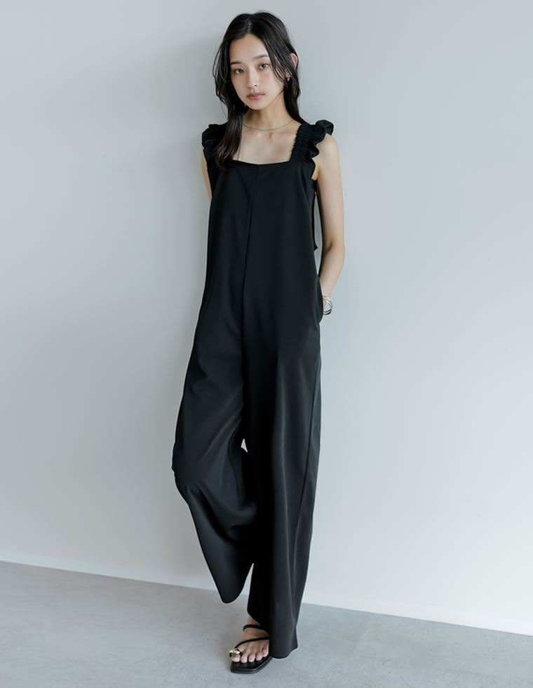 SC-Lサイズ [低身長サイズ有][洗濯機で洗える]フリルストラップスクエアネックオールインワン レディース 秋 冬 オールインワン つなぎ フリルストラップ バックシャン バックリボン