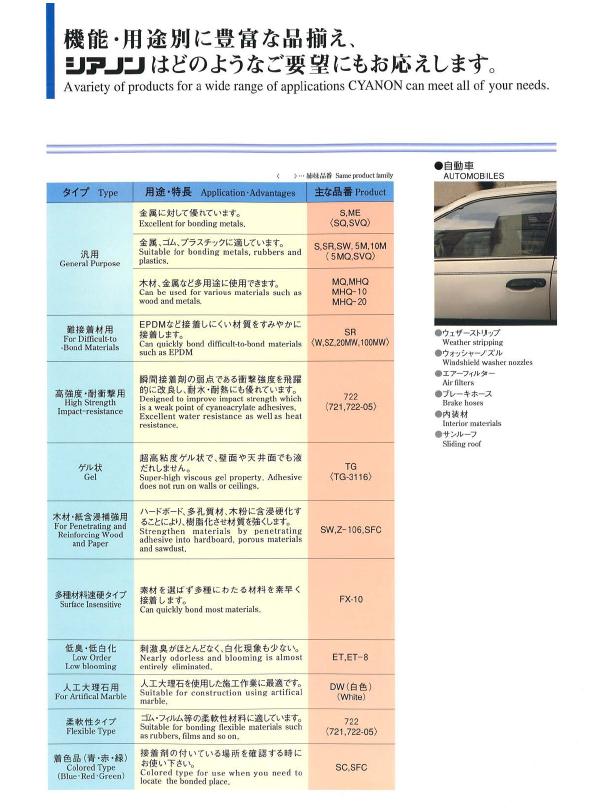 【仕様】低粘度で液状の接着剤。ハードボード、多孔質材、木粉等に含浸硬化することにより、樹脂化させ材質を強くします。【用途】金属・ゴム・硬質プラスチック・木材の接着 ※ご使用前に必ず用途が適当かどうかを確認し、予備テストを行ってからご使用ください。【接着できないもの】ポリエチレン・ポリプロピレン・シリコン樹脂・フッ素樹脂・ガラス・素焼きの陶器などは接着しません。シアノン SWは、シアノアクリレートモノマー(単量体)を主成分とした瞬間強力接着剤で、被着体の表面及び空気中の微量な水分により、急激に化学反応 (イオン重合)をしてポリマー(重合体)となり、この時に強力な接着結合が得られます。1. 特徴・低粘度速硬化品です。・接着工程のスピードアップに最適です。・主として金属、ゴム、プラスチック接着用に適しています。・木粉の固着に適しています。2. 性状品名シアノン SW主成分エチルシアノアクリレート外観無色~淡黄色透明液体比重(20℃)1.06粘度(mPa・s/5℃)2引火点(℃)803. 性能セットタイム(秒)3引張剪断強度(N/mm²)15 試験方法JIS K6861-1995 「α-シアノアクリレート系接着剤の試験方法」テストピース:鋼/鋼温湿度:23℃-50%RH接着剤 瞬間接着剤 プラモデル おもちゃ 金属模型 模型 シアノアクリレート 大容量 業務用 低粘度 含浸 重曹 パテ 硬化 さらさら サラサラ 浸透 穴埋め