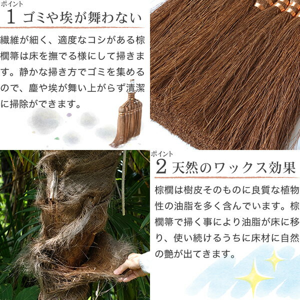 ◆製品仕様-Product Specifications- サイズ 約 25.0W×125.0H (cm) 材質 シュロ(毛)、竹(柄)、銅(巻線)、鉄(鋲) メーカー 山本勝之助商店 産地 和歌山県 海南市 備考 ラッピングをご希望の場合、専用のアイボリー色の不織布バッグでお包みいたします。 ◆お手入れ方法-How to Care- 特別なお手入れは不要ですが、箒に埃や髪の毛が付いているのが気になった場合、軽く払ったり手でゴミをつまんで引っ張ると簡単に取ることができます。 使わない時は吊るし掛けて保管ください。毛先を床につけて立てかけたままにすると、毛先に癖がついて掃きにくくなってしまいます。 ◆使用上の注意-Handling Instruction- 天然繊維の粉末や抜け毛を最初によく落としてからお使いください。 キズつきやすいものには使用しないでください。 火の側や高温になる場所に置かないでください。 本来の用途以外に使用しないでください。 廃棄時は自治体の定める方法に従って処理してください。 手作業のため、色合いやサイズに個体差がございますが使用上の問題はございません。 ◆商品説明-Description of item- 古くから日本人の生活に欠かせなかった和箒。数百年の歴史があるといわれている伝統的な棕櫚箒は、自然素材でありながら丈夫で長持ち。 原料の棕櫚の皮の繊維は細く弾力があってしなやかで、畳やフローリングなど様々な素材に安心して使用できます。 しっかりとした密度と厚みのある穂先で撫でるように掃けば、埃を舞い上がらせる事無く塵や埃を逃さずキャッチ。 また、繊維に含まれる油脂が、掃けば掃くほど床材の自然の艶を引き出し天然のワックス効果もあります。 使いやすさにこだわり、熟練の紀州職人がひとつひとつ丁寧な手作業で作る最高級の棕櫚箒は使い続けるごとに愛着が増します。 現代の暮らしに取り入れたくなる、美しい機能美と造形美を兼ね備えた贅沢な逸品です。 ※箱の形状、色などは変更となる場合があります。 ※画像の色はブラウザや設定により、実物とは異なる場合があります。予めご了承下さい。■ 追加オプションをご希望の方へ 名入れ・照明加工・紙袋・有料のラッピングなどの追加オプションは、商品とは別途料金がかかります。 ご希望の追加オプションをカートに入れ、商品と一緒にご注文ください。 カートに入れずにご注文いただいた場合はオプション料金を店舗側にて追加させていただきます。お支払い方法に前払いをお選びの場合は、楽天市場からの追加変更の案内をお待ちいただき、変更後の金額でお支払い下さい。