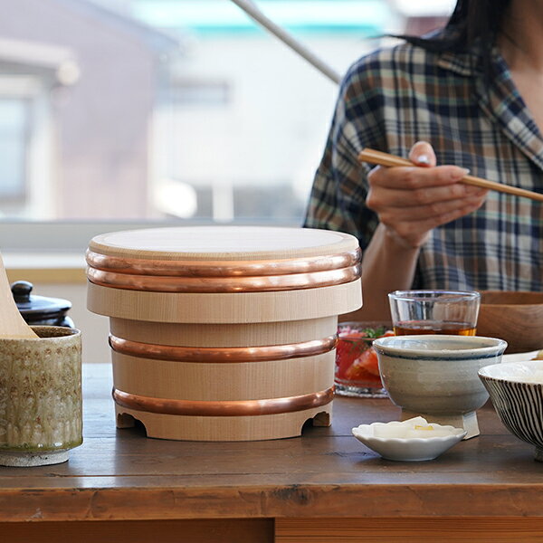 ◆製品仕様-Product Specifications- サイズ 約Φ21×H14cm(外寸)/ 約Φ18×H13cm(身のみ) 重量 約640g 材質 木曽さわら/銅 メーカー 山一(長野県木曽郡南木曽町) パッケージ ボール紙 ◆お手入れ方法-How to take care- 初めてご使用になる時は、アク抜き、匂い抜きを行ってください。 ご使用前は、桶の内側を濡れた布巾で軽く拭いてからご使用ください。 ご使用後は、洗剤を使わず、粉状のクレンザーが塩を使い、桶の内側と外側を丁寧に洗った後、風通しの良い所で充分に日陰干しをしてください。 1ヶ月以上使用しない場合は、お櫃の身と蓋を別々に紙か綿布に包んで保管してください。 ◆商品説明-Description of item- 信州木曽の厳しい気候に育まれた木曽サワラを使用した山一のお櫃。 伝統的な木のお櫃は、炊きたてご飯の余分な水分を吸収し、上手に水分量を調整してくれるので、冷めてもパサつかず美味しいご飯に仕上がるのです。 江戸時代から「桶は木曽のさわらが一番」と言われており、他の産地にはない独特の赤みがあり、耐酸性と耐水性に富んでいます。 山一の桶は、木肌のツヤを生かし耐水性を上げる江戸時代からの伝統技法「鉋仕上げ」。 ツヤのある木肌と銅のタガで締められた昔ながらの江戸びつ。 使用するうちに銅の色が味わい深く変化し、趣のある佇まいはキッチンで見せたくなる暮らしの道具です。 ※箱の形状、色などは変更となる場合があります。 ※画像の色はブラウザや設定により、実物とは異なる場合があります。予めご了承下さい。■ 追加オプションをご希望の方へ 名入れ・照明加工・紙袋・有料のラッピングなどの追加オプションは、商品とは別途料金がかかります。 ご希望の追加オプションをカートに入れ、商品と一緒にご注文ください。 カートに入れずにご注文いただいた場合はオプション料金を店舗側にて追加させていただきます。 お支払い方法に前払いをお選びの場合は、楽天市場からの追加変更の案内をお待ちいただき、変更後の金額でお支払い下さい。