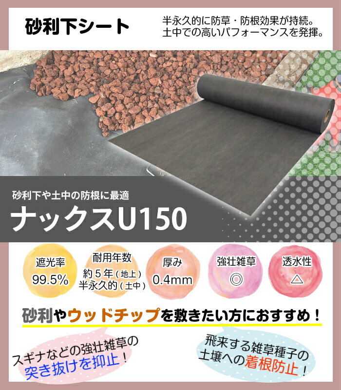 砂利下専用防草シート「ナックスU150(1m×50m) Uピン(100本) シール(100枚)セット」厚さ0.4mm/耐用年数半永久的(土中使用)(送料無料) 雑草対策 白崎コーポレーション