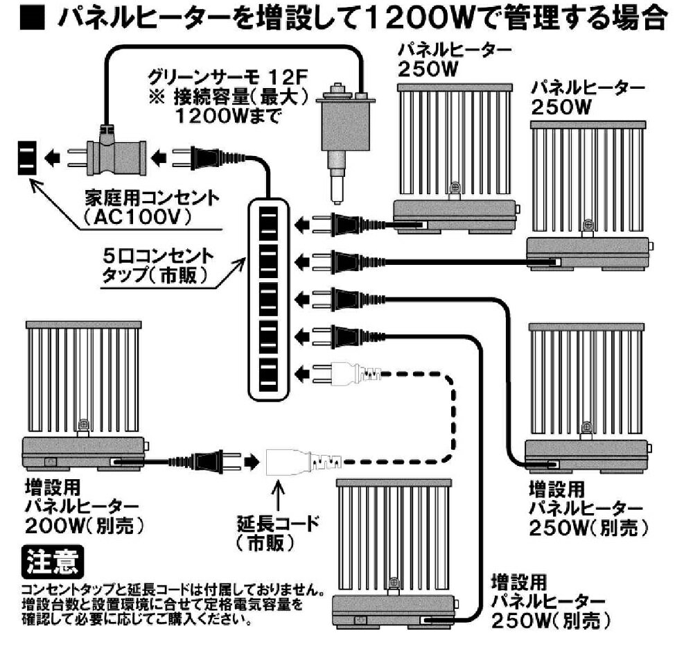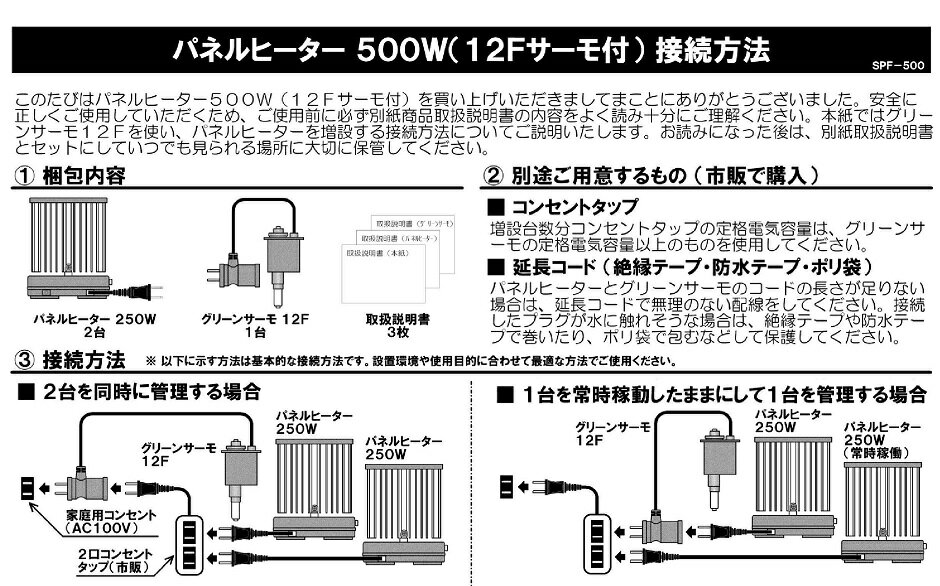 ★北海道・沖縄・その他一部地域への配送受付終了のお知らせ★ 大変申し訳ございません。こちらの商品は、北海道・沖縄・その他一部地域への配送が出来なくなりました。システム上、該当地域へのご注文は可能ですが、後程店舗が確認次第(受注確認のメール送信後)にキャンセル処理させて頂きますので、ご理解頂けます様お願い申し上げます。 ・コンパクトサイズです。温室内で場所をとりません。 ・放熱板からのゆるやかな放熱で、温室内に自然対流を起こします。 ・モーター・ファンを使用していないので、夜間でも作動音が気にならない静音タイプです。 ・コードは本体内に巻取り収納(手動)でき、邪魔になりません。 ・500Wの大型のヒーター(250Wx2台)と大容量サーモスタット(温度調節器)とセットにより、不便さ・問題を解消しました。 別売りの増設用パネルヒーターで、最大で250Wx4台+200Wx1台(合計1200W)まで接続可能。 保温場所のサイズや環境に合わせて、様子を見ながらヒーターを増やせます。 ●パネルヒーター250Wx2台 1台のサイズ サイズ:Φ127×H194(mm) ※ダイヤル・コード突出部含まず 電源:AC100V 消費電力:250W 電源コード:約1.5m(巻取り収納型) 素材:本体(ABS)・放熱板(アルミニウム) 安全装置:温度ヒューズ内蔵 ●グリーンサーモ12F x1台 ・定格電圧:AC100V ・ヒーター容量:1200W ・温度範囲:15℃〜40℃ ・精度:±1.5℃ ・サイズ:幅75×奥行39×高さ160(mm)※コード・突出部含まず ・結線タイプ:電源プラグ・ヒーター接続プラグ ・用途:加温用・空中又は土中へ感温部差込