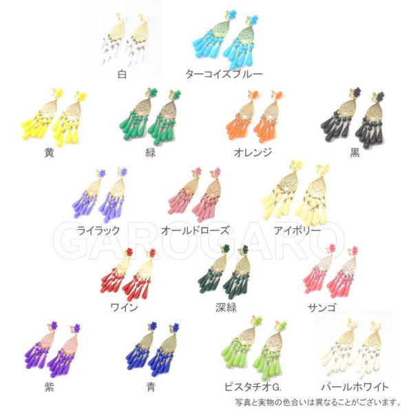 おすすめポイント: 軽くて色のバリエーションが豊富なフラメンコ用イヤリング。 踊りの邪魔にならない軽さが嬉しいイヤリング。 色のバリエーションが豊富なので、お好みの色がきっと見つかるはず。 手頃な価格なので、グループで揃えるのにピッタリです。 --- 【ピアス針なし】クリップとねじで留める日本式の留め具を使用しています。 --- 素材: プラスチック・金属 サイズ(縦の長さ×横幅)cm: 約10.0(飾り部分の長さ:8.1)×3.5 (掲載のサイズは製品の実測値です。多少の個体差がありますがご容赦ください。) 【コーディネイト例】 ・メタルのペイネシージョ(小さな櫛) Camelia(カメリア) 色:ゴールド ・花束風 Mariam(マリアン) フシアピンク×黄緑系 補足説明・ご覧になるモニターによって、実物と写真の色合いが異なって見える場合があります。 ・衛生上の理由から、商品が入った透明な袋を開封後は返品、交換ができません。 ・この商品は、湿気などにより稀にさびなどが付着する場合がございます。また、製造時につく細かい傷やこすれ、バリ(型との接合部分の残り)、色むら等がある場合があります。 大きく目立つ場合は検品時に取り除きますが、舞台でご使用するのに問題ないと判断できる程度である場合は良品と判断致します。あらかじめご了承下さい。