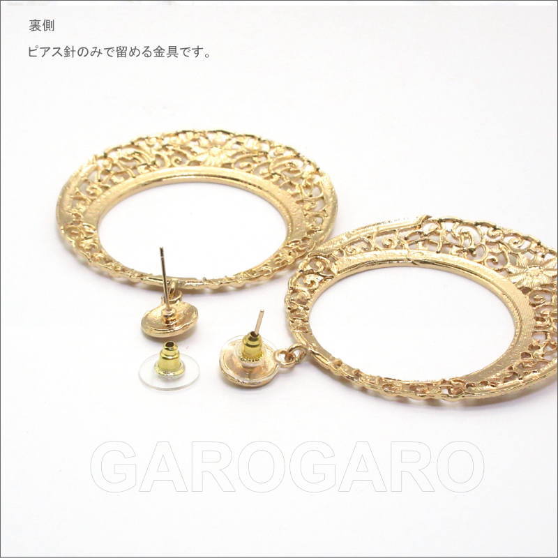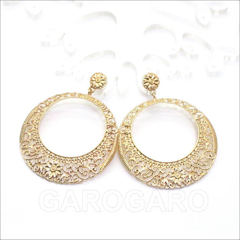 おすすめポイント: 以前はシルバーが多かったフラメンコのアクセサリですが、最近はゴールドも多く使われるようになりました。 ”イエベ”の方にとっては、肌との相性も良いのがうれしいですね。 フラメンコらしい、輪の飾り。サイズも大きすぎず、繊細な透かし模様が素敵です。 --- 【ピアス】ピアス針のみで留める金具を使用しています。 --- --- 素材: 金属 サイズ(縦の長さ×横幅)cm: 約7.0(飾り部分の長さ:約5.3)×5.3 (掲載のサイズは製品の実測値です。多少の個体差がありますがご容赦ください。) 【コーディネイト例】 ・上品色のバラの花束風 HA-1 ブルー×くすみピンク系 ・メタルのペイネシージョ(小さな櫛) Abanico(アバニコ) ゴールド 補足説明 ・ご覧になるモニターによって、実物と写真の色合いが異なって見える場合があります。 ・衛生上の理由から、商品が入った透明な袋を開封後は返品、交換ができません。 ・この商品は、湿気などにより稀にさびなどが付着する場合がございます。また、製造時につく細かい傷やこすれ、バリ(型との接合部分の残り)、色むら等がある場合があります。 大きく目立つ場合は検品時に取り除きますが、舞台でご使用するのに問題ないと判断できる程度である場合は良品と判断致します。あらかじめご了承下さい。