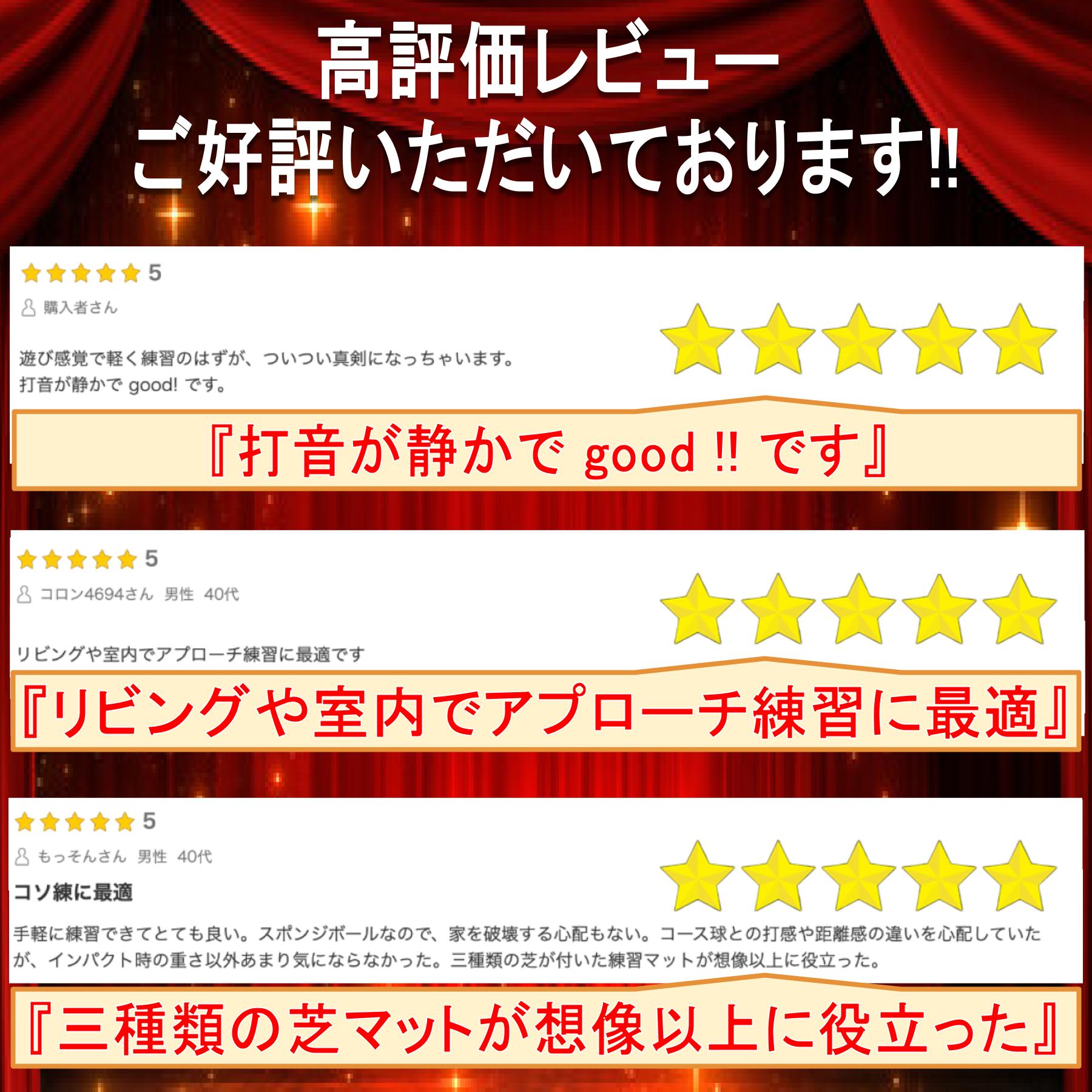 商品情報サイズ・3Wayラフマット:幅 300mm 奥行き 600mm 高さ 18mm 重さ 541g・跡がつくマット:幅 300mm 奥行き 400mm 高さ 8mm 重さ 400gセット内容【ゴルフアプローチ練習】アプローチネット芝マットEVAスポンジボール20個収納袋色緑・グリーン注意モニターの環境により、色の見え方に若干差が生じる場合があります。アプローチ練習 アプローチ練習器具 ゴルフマット スイングマット ゴルフネット アプローチネット ゴルフ練習器具 室内 トレーニング アプローチ 芝マット 人工芝 ラフ 3Way EVAボール スポンジボール 20個 収納袋付き 30-60cm アプローチ練習 ゴルフネット ゴルフマット アプローチ練習器具 ゴルフアプローチ 練習用 アプローチネット ゴルフアプローチ アプローチマット ゴルフ マット ラフ 【自宅ゴルフ練習セット・アプローチ練習器具】 自宅の室内や庭でのアプローチ練習に最適なゴルフ練習器具セット。 スイング・素振りトレーニングにぴったりのマット・ネット・ボールが揃っています。 【ラフ・芝・短い芝の3種類構成】 芝風マットは「ラフ(35mm)」「芝(15mm)」「短い芝(10mm)」の3種類。 様々なシチュエーションを想定したトレーニングが可能です。 【衝撃吸収!床を傷つけない厚みのあるマット】 裏面には滑り止め加工を施し、フローリング上でもズレにくい仕様。 人工芝の下にスポンジを重ねた2層構造で、打撃時の衝撃をしっかり吸収します。 【音が響かないEVA素材のスポンジボール20個】 軽くクッション性のあるEVA樹脂を採用。 家具を傷つけず、静かな打感で夜間練習にも最適です。 ボールの回転が見やすいデザインもポイント。 【持ち運び&収納が簡単】 マット・ネット・ボールをまとめて収納できる袋付き。 自宅での片付けや屋外への持ち運びにも便利です。 【大きめサイズのアプローチネット】 シンプルで使いやすいネットで、精度アップに最適。 ボール回収の手間も減らせます。 ※収納時は「8の字」を描くように折り畳むと、2重の円になります。 【製品情報】 ・人工芝マット:600×300×18mm(人工芝10mm+SBRスポンジ8mm) ・アプローチネット:500×500×400mm ・ライン入りカラーボール20個:直径42mm(EVA素材) ・収納袋:ポリエチレン製(420×320mm) ※モニター環境により、色味が若干異なる場合があります。 5