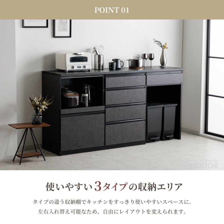 ITEM-スペック-商品について キッチンに圧迫感を与えないカウンタータイプ。収納部分は左右入れ替え可能ですので、自分好み好みの配置が叶います。使いやすい3タイプの収納エリアを備えており、物に溢れがちなキッチンが綺麗に片付きます。オープン収納部分には湿調機能があるモイスと1500Wまで使用可能なコンセント付き。そのほか、2Lペットボトルが入る大型の引き出しや可動棚など充実の収納機能を完備しています。サイズ W180×D48×H95cm カラー ホワイト(木目調) ・ ブラック(セラミック調)素材・材質 天板:エナメル塗装表面加工:ハイグロスシート(木目)表面材:MDF側面材:プリント紙化粧合板 配送について送料無料 (開梱設置サービス便付きです。)(組立て作業、ご指定の場所へ設置、梱包材の持ち帰りも全ておこないます。)保証について当店の家具には、保証書が付属しておりません。商品の保証は、メーカー保証にて商品到着より1年間となります。※一部商品を除く。 ご理解の程、宜しくお願い申し上げます。ご不明な点等ございましたら、当店までご連絡の程よろしくお願い申し上げます。備考・色見本、生地見本、板見本等ご要望の場合は、当店までご連絡くださいませ。 (商品によってはご準備できないものも御座います。ご了承の程よろしくお願いします。)・商品の使用は随時改善されており、入荷時期により多少のデザイン変更が行われている場合がございます。 リピート注文等で全く同様の形をご希望される方はくれぐれもご注意下さい。・当店は、基本的にお客様都合によります、返品・交換はお受けしておりません。 イメージ違い・注文間違いの場合も含まれますので、ご注文前に今一度ご確認をお願い申し上げます。 詳細は、会社概要の返品につきましてをご確認頂きます様よろしくお願いします。・不要家具のお引取り、処分を行なっております。(一部対象外地域あり)詳しくは、下記URLよりご確認下さい。https://www.rakuten.ne.jp/gold/gbft-interior/hikitori/index.html当ストア人気ランキング »よくある質問 »お客様高評価レビュー商品はこちら »