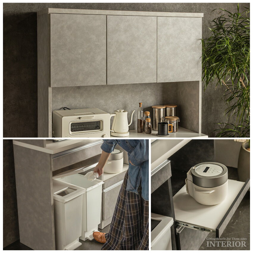 625円OFFクーポンSS期間限定! 食器棚 ハイタイプ キッチンボード ダストスペース スリム 120 90 モイス付 ごみ箱置き場 ダスト 120幅 90幅 おしゃれ 120cm 90cm 高さ180 ワイド 収納 モルタル風 日本製 グレー ライトグレー 完成品 【送料無料/組立・設置付】
