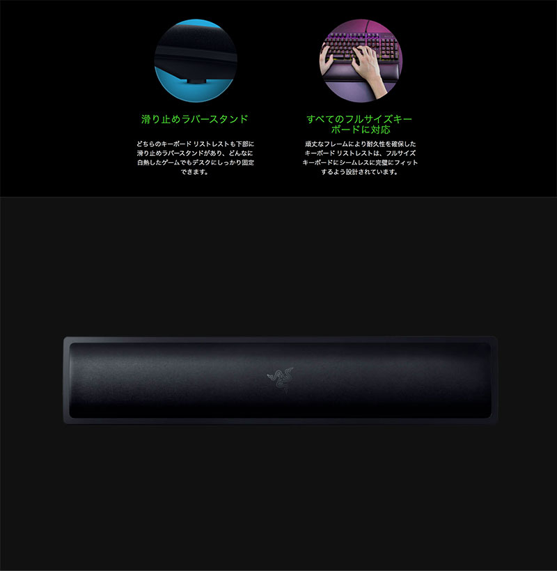 Razer Ergonomic Wrist Rest Pro ■ 涼しく快適にゲームプレイ Razer フルサイズ キーボード用エルゴノミック リストレストとリストレスト プロで疲れることなく最高のゲーミングパフォーマンスを維持できます。 選択したモデルが何であれ、Razer のキーボードリストレストにより白熱したゲームも快適にプレイできます。 ■ 冷却ジェル注入型クッション -プロバージョン- Razer フルサイズ キーボード用エルゴノミック リストレスト プロの冷却ジェル注入型メモリーフォームクッションは、特殊な熱伝導ファブリックに覆われ、手首からの蓄熱と圧力を軽減するため、長時間のゲームプレイでも涼しく快適に保ちます。 ■ 滑り止めラバースタンド どちらのキーボード リストレストも下部に滑り止めラバースタンドがあり、どんなに白熱したゲームでもデスクにしっかり固定できます。 ■ すべてのフルサイズキーボードに対応 頑丈なフレームにより耐久性を確保したキーボード リストレストは、フルサイズキーボードにシームレスに完璧にフィットするよう設計されています。 ※モニターの発色の具合によって実際のものと色が異なる場合がございます。 [仕様情報] 冷却ジェル注入型メモリーフォームクッション 滑り止めラバースタンド すべてのフルサイズキーボードに対応 技術仕様 頑丈なフレームを組み込んだシームレスなデザイン すべてのフルサイズキーボードに対応 製品寸法 : 幅 : 90 mm / 3.54” 長さ : 444.5 mm / 17.5” 高さ : 26.4 mm / 1.03” 概算重量 : Razer エルゴノミックリストレストプロ : 423 g / 0.93 lbs よくある質問 Q : 2 つのリストレストの違いは何ですか? A : Razer エルゴノミック リストレスト プロは、冷却ジェル注入型メモリーフォームクッションをファブリック素材で覆っています。 Q : Razer エルゴノミック リストレスト プロの表面の素材は何ですか? A : 特殊な熱伝導ファブリックを採用しています。 Q : これらのリストレストは Razer Chroma RGB に対応していますか? A : いいえ。現在 Razer Chroma RGB はどちらのリストレストにも対応していません。 Q : これらのリストレストのクリーニング方法は? A : 軽く湿らせたきれいな布で表面の汚れをやさしく拭いてください。刺激の強い化学製品はリストレストを傷める恐れがあるため使用しないでください。 Q : これらのリストレストは私のキーボードに対応していますか? A : フルサイズ キーボードに対応した設計になっています。 [保証期間] 1年間 [メーカー]レーザー Razer [商品型番] RC21-01470100-R3M1 [バーコード] 4589967503862 [色] ブラック[性能] ゲーム向け[対応] フルサイズ キーボード[用途] ゲーミングRazer Ergonomic Wrist Rest Pro フルサイズキーボード用 冷却ジェル注入型クッション # RC21-01470100-R3M1 レーザー 【バリエーション】 [family] 5009618091