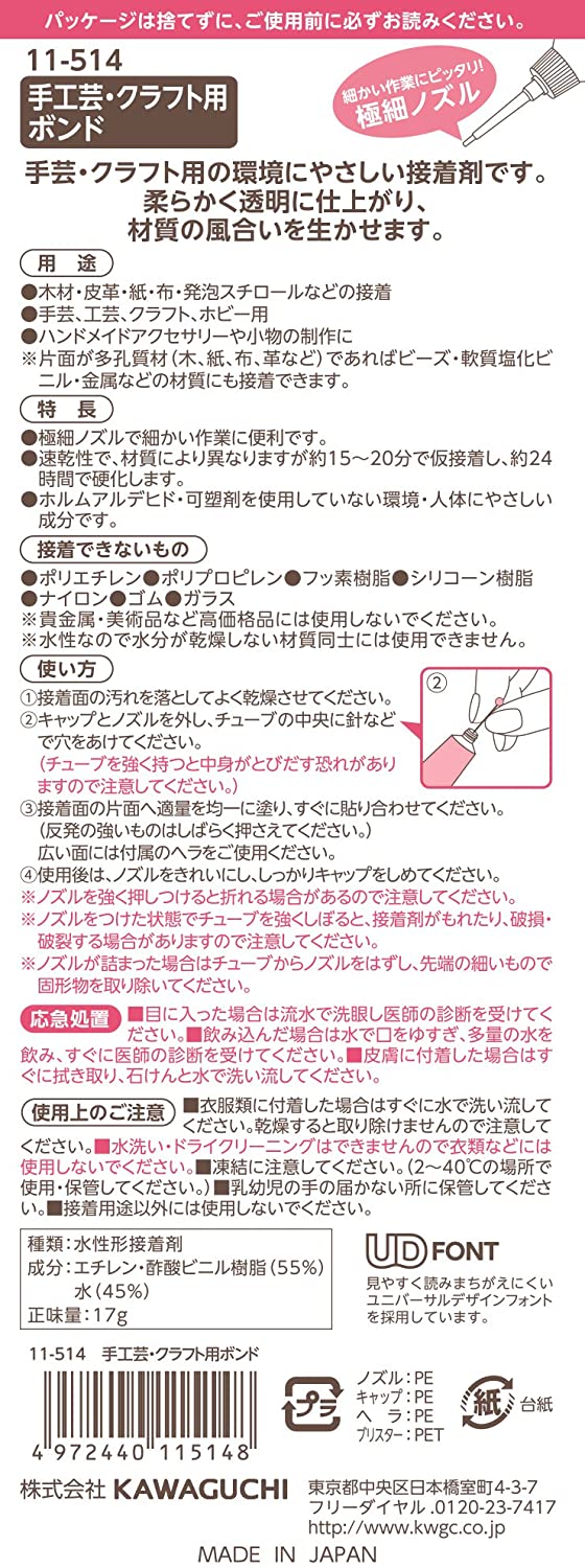 手工芸・クラフト用ボンド 11-514 KAWAGUCHI カワグチ ボンド 手芸 裁縫 ハンドメイド 接着剤 手芸用 クラフト用