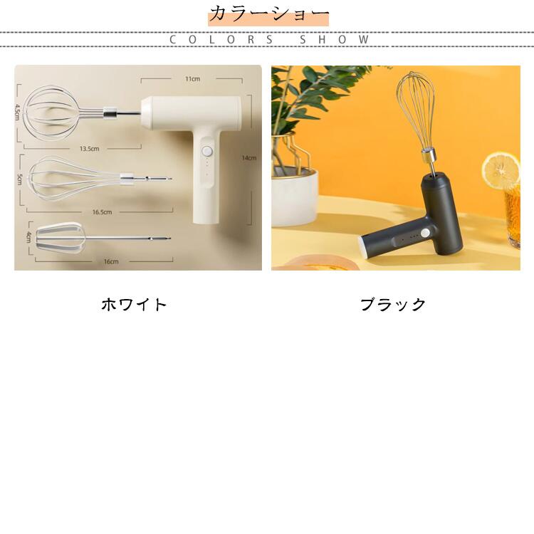 大中小3種類のウィスク付き USB充電式 3段階スピード調節ハンドミキサー【USB充電式&コードレス】バッテリー:2000mAh充電式リチウムバッテリー、一回3時間充電だけで長く使用できます。コードレス設計、場所を選ばなくても使用できるので便利!!使いやすい!!【3段階のスピード調整】ビーターの回るスピードを。1段階:低速展 。2段階:中速でかき混ぜます。3段階:高速泡立て,卵白,バター,ムース。高速で素早く泡立て、低速で泡のキメを整えて仕上げられます。【三つのミキシングビーター付属】サイズ3種類のウィスク付きサイズについての説明バッテリー容量:2000mAh定格電圧:3.7V入力電圧:5V入力電流:1A出力電力:20Wモーター回転数:18000rpm商品のサイズは手作業で測定させて頂いておりますので、若干の誤差があります。素材ABS/304ステンレス色ホワイト ブラック備考出荷前に全て検品を行っておりますが、万が一商品に不具合があった場合は、お問い合わせフォームまたはメールよりご連絡頂けます様お願い申し上げます。速やかに対応致しますのでご安心ください。▼商品の色は、撮影時の光や、お客様のモニターの色具合などにより、実際の商品と異なる場合がございます。あらかじめ、ご了承ください。▼同じ商品でも生産時期により形やサイズ、カラーに多少の誤差が生じる場合もございます。▼サイズ詳細等の測り方はスタッフ間で統一、徹底はしておりますが、実寸は商品によって若干の誤差(1cm〜3cm )がある場合がございますので、予めご了承ください。ハンドミキサー ホイッパー 電動 泡立 ホワイト ブラック