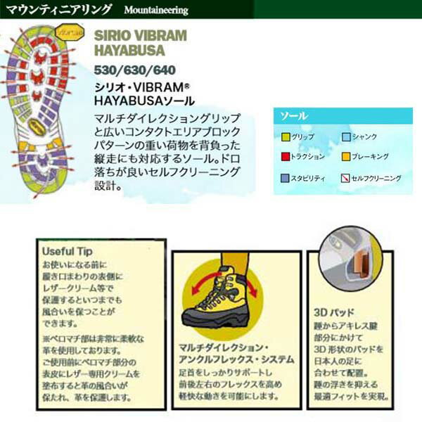 P. F. 530 イタリア製ヌバックレザーモデル。3シーズンのハードトレッキング向けレディースモデル。 ワイズ3E+ (Ladies) ウェイト(片足) 約690g/25.0cmm ソールスタンス 6cm アッパー:ダ ニ・ア ンフィビ オ・ヌ バ ックレ ザ ー(2.4mm)アナトミックタングア シ メトリック・ア ッパ ーワイドラバ ープ ロテクトフレックスアンクルパッドスティールシューレースフック ゴアテックスファブリクス:ゴ ア テックス・パ フォ ー マン ス・コンフォート・フットウエア シ ャンク:プラスチックソフト ソール:シリオ・VIBRAM HAYABUSA ソール張替え:〇 SIRIO/シリオとは 1993年、「日本人専用木型の登山靴」のシリオが誕生しました。 日本人足型を研究、企画、開発。これらをもとにイタリアで設計、メイン生産を行っています。 日本のニーズに応え、イタリアの技術と伝統が靴に命を吹き込む。それが「シリオ」です。 ※メーカーやモデル等によりサイズ感は異なります。サイズは目安としてお考えください。 ※写真の色と実際の商品の色は多少異なる場合がございます。 ※商品画像はメーカー提供のサンプル画像です。 製品仕様・デザインは改良のため予告なく変更される場合がありますのでご了承ください。 この商品のお支払いはキャッシュレス決済(クレジット決済・ポイント支払い)のみです。 ・キャッシュレス決済(クレジット決済・ポイント支払い)以外をお選び頂いた場合、注文後の変更が出来ないため、ご注文のキャンセル処理をいたします。 ※ご注文後のお客様都合によるキャンセルや変更は承っておりませんので、ご確認の上ご注文をお願いいたします。 正規品 未使用新品 当店のブランド商品は全て本物です。安心してショッピングをお楽しみください。