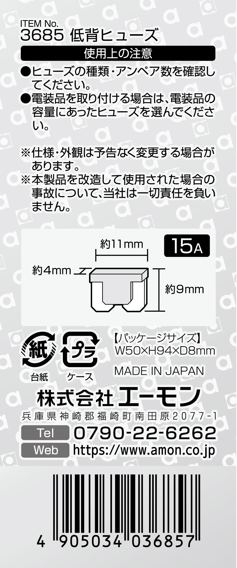 エーモン 3685 低背ヒューズ 15A 【クリックポスト】
