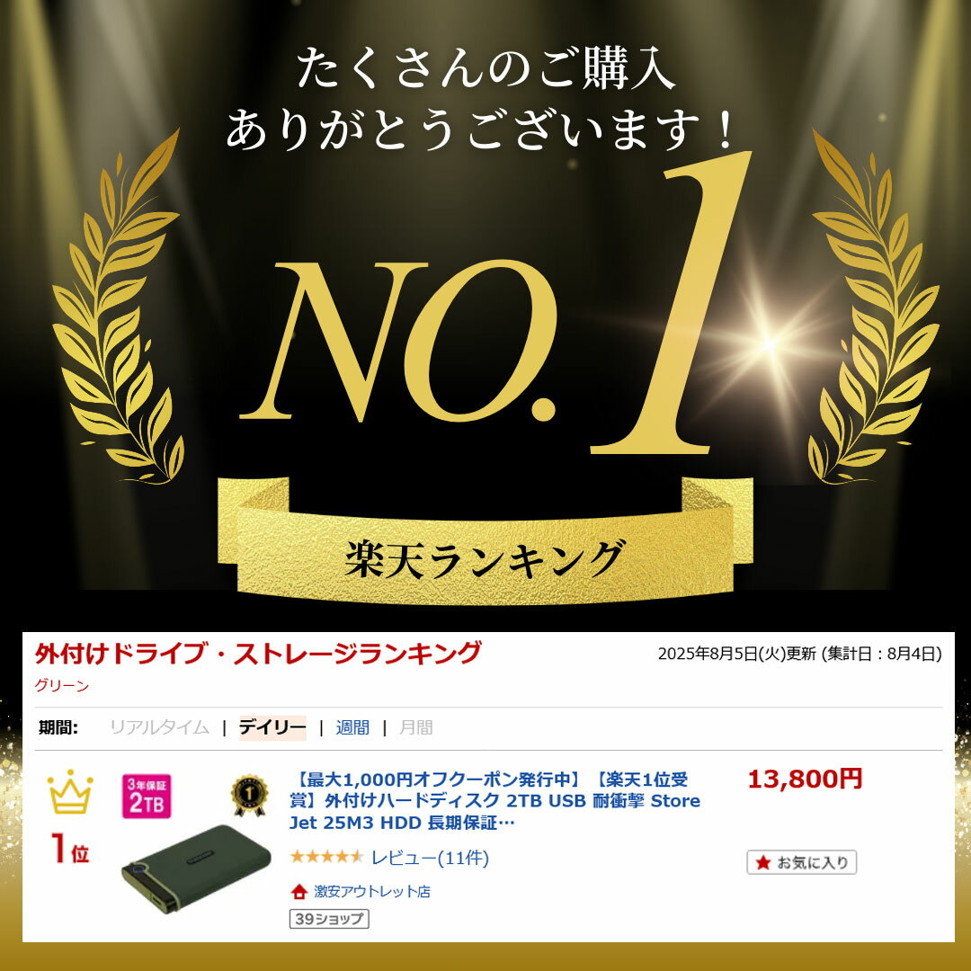ハイレベルな衝撃耐性を兼ね備えており、ワンタッチで自動バックアップ可能な効率性にも優れた外付けハードディスク。Transcend(トランセンドジャパン)製。3年保証。TS2TSJ25M3G。2TB。<特長>●StoreJet 25M3には、ドライブに保存されたデータをより安全に保護するための米軍の落下試験基準に適合する3段階衝撃保護システムが搭載されています。●便利なワンタッチ自動バックアップボタンが設置されており、時間を無駄にすることなく、即時にバックアップ、同期、大容量ファイルのコピーが行えます。●SuperSpeed USB 3.1 Gen 1に対応しています。●電源供給はUSBより行われるので外部アダプタ不要です。●安全な取外し後にハードドライブを再接続せずにドライブを検出させるクイック認識機能付きです。●Transcend Eliteソフトウェアが利用可能です。(Microsoft Windows 7 以降、macOS 10.10以降) ●安心の3年保証です。※StoreJet25をPCに接続したとき、USB HUBを使用しますと、電源不足となる可能性がありますので避けてください。※StoreJetの保証シールを破ったり剥がしたりすると製品保証が受けられなくなりますのでご注意ください。<仕様>■容量:2TB■サイズ:W129.5×D80.8×H16.1mm■供給電源:USB DC 5V■動作環境温度:5℃(41℃F)から55℃(131℃F)■ストレージメディア:2.5インチSATA HDD■重量:185g■認証:CE、FCC、BSMI■インターフェイス:USB3.1 Gen1■パワーセーブモード:10分■ワンタッチバックアップ機能付き■保証期間:ご購入日より3年※保証規定につきましては、メーカーページからご確認ください。※トランセンド社取扱製品のため、お客様サポートにつきましては下記「トランセンド製品のお客様サポートについて」をご確認ください。※転送スピードはすべての環境において保証されるものではございません。※1GBは1,000,000,000バイトですが、OS上では1,024MBを1GBとして計算されるため、0.93GBと表示されます。※すべてのブランド名は各社の登録商標です。※仕様は予告なく変更される場合がございます。<対応機種>■対応機種:NEC・富士通(FMV)・SONY(VAIO)・パナソニック・東芝(dynabook)・lenovo(レノボ)・DELL(デル)・HP・ASUS・エプソン・Apple (アップル)などUSB 2.0またはUSB 3.0ポートを搭載したパソコンLinux Kernel 2.6.31以降■対応OS(PCとの接続時):Microsoft Windows 7 以降、macOS 10.10以降Linux Kernel 2.6.31以降保証期間:ご購入日より3年◆トランセンド製品のお客様サポートについて◆商品の仕様確認及び故障対応につきましてはトランセンド社の直接相談となります。当店では返品および商品交換等のサポートが出来ませんので、予めご了承ください。商品名及びシリアル番号を確認の上、下記にトランセンドお客様窓口にご相談ください。≪トランセンドお客様窓口≫ サポートダイヤル 03-5820-6029 受付時間(10:00〜12:30 13:30〜18:00)(土曜、日曜、祝祭日、その他トランセンドが定める休業日を除く)<関連キーワード>Transcend,2TB,StoreJet25M3,外付けハードディスク,耐衝撃,2TB,HDDラインナップ