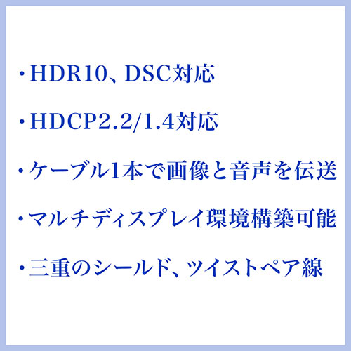 8K/60Hz、4K/120Hzに対応した、DisplayPortケーブル。最大32.4Gbpsの伝送速度に対応し、高精細で立体感、臨場感のある映像を伝送可能。Displayport規格ver.1.4認証取得品。8K/60Hz、4K/120Hz、HDR10、DSC、HDCP2.2/1.4対応。1.5m。黒色。<特長>●DisplayPortに対応したパソコンとディスプレイとを接続するDisplayPortケーブルです。●DisplayPort規格ver.1.4認証取得品で、最大32.4Gbpsの伝送速度に対応し、最大8K/60Hz、4K/120Hzの高解像度表示が可能です。●明暗の差をよりダイナミックに表現できる、HDR10「High Dynamic Range(ハイ・ダイナミック・レンジ)」に対応しています。●VESAで規格化された映像信号圧縮技術Display Stream Compression (DSC)に対応しています。●1本のケーブルで画像+音声の伝送が可能で、最大32チャンネル、1536kHz/24bitまでのオーディオストリームに対応しています。 ※●複数のディスプレイを数珠つなぎにしたり、ハブ経由で接続したり、簡単にマルチディスプレイ環境を構築できます。●コンテンツ不正コピーを防止するHDCP2.2/1.4に対応しています。●ケーブルの中心から、「アルミシールド(ツイストペアケーブル)→アルミシールド→高密度編組シールド」と三重のシールド処理を施し、ノイズから大切なデータを守ります。●芯線を2本ずつよりあわせたノイズに強いツイストペア線を使用しています。●サビにも強く、経年変化による信号劣化の心配が少ない金メッキ処理を施したピンを使用しています。<仕様>■カラー:ブラック■ケーブル長:約1.5m(コネクタ含む)±50mm公差あり■ケーブル直径:約4.5mm■コネクタ形状:DisplayPort オス - DisplayPort オス■線材規格:UL20276 34AWG■Displayport規格:Displayport ver.1.4認証品■生産国:中国■取扱説明書:なし■保証期間:初期不良のみ■対応機種:DisplayPort出力端子を搭載したパソコンなどDisplayPort入力端子を搭載したディスプレイ、モニター、プロジェクターなど※音声信号の入出力は機器のオプション機能になっていますので、対応した機器同士が必要です。※各機能に対応した機器、環境が必要です。※環境、機器により、正常に動作しない場合があります。※全ての機器での動作を保証するものではありません。<関連キーワード>500-KC025-15 サンワサプライ ディスプレイポートケーブル,DisplayPort,8K/60Hz,4K/120Hz,HDR10対応,1.5m,バージョン1.4認証品,ブラック