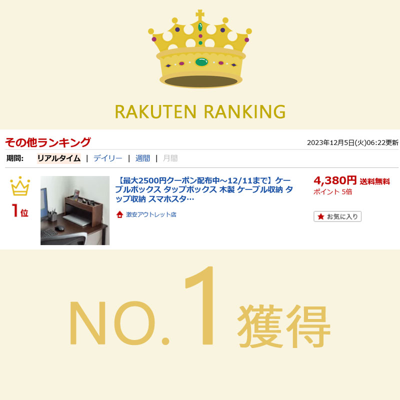 電源タップやスマートフォン、タブレットの設置も可能なケーブルボックス。机上を整理でき、下部にはノートパソコンやタブレットの収納も可能。ケーブル用スリット付きでタブレットやスマホの充電に便利なスタンド機能付き小型木製ケーブル収納ボックス。<特長>●ケーブルや電源タップなどが綺麗に収納できる木製の収納ボックスです。●ごちゃごちゃしがちなケーブルをキレイにし見た目もスッキリさせることができます。●天板には、スマートフォンや小物などを設置できるスペース付きです。●天板にはスリットがありタブレット、スマートフォンスタンド機能搭載しています。●別途充電器を使用した充電時には底面にセットしたコネクタを接続し、スムーズに充電が可能です。●前面パネルはマグネットで開閉が可能で、電源タップのスイッチのON/OFFが簡単に行え、機器のメンテナンスや配線の組み替えも楽に行えます。●内部には、タップの落下防止バー付きです。●ネジ穴は目隠しシール付きで、底面には滑り止めシール付きです。●下部にはノートPCやタブレットが収納可能です。<仕様>■メインカラー:ダークブラウン■サイズ:約W450×D145×H215mm■重量:約2.6kg■総耐荷重:5kg■上部内寸:約W425×D104.5×H105mm■下部ノートパソコン収納部内寸:約W426×D145×H50mm■材質:木(パーティクルボード、MDF)■出荷形態:お客様組立式(ノックダウン組立式)■生産地:中国■保証期間:初期不良のみ■取扱説明書:日本語取扱説明書あり<関連キーワード>200-CB038DBRM サンワサプライ タップ収納 スマート キッチン 書斎 リビング収納 ウッドラック オープンラック かんたん キャビネット シェルフ シンプル スリム テレフォン ナチュラルインテリア ブラウン モデム収納 ルーター収納 収納家具 整理棚 扉付き 北欧 おしゃれ 収納 整理 整頓 配線 省スペース 隠し まとめ タップボックス コンパクト コード ケーブル カバー サンワサプライ 4969887889398 4969887889404