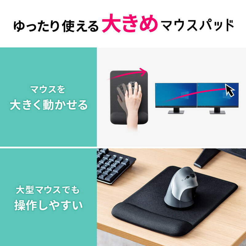 リストレスト付きの大型マウスパッド。手首の疲労軽減や腱鞘炎防止。クッション性がありマウス操作を快適にする。手首に優しいマウス用ジェルクッション付き。ブラック。<特長>●マウスを大きく動かしてもマウスや腕がはみ出しにくい、リストレスト付きの大型マウスパッドです。●幅21cm、縦29.5cmと大型なのでいろいろな位置にマウスを置いて使用できます。●リストレストは、約1.7cmと程よい高さと柔らかさのジェルを内蔵しています。●表面は快適な肌触りでスムーズなマウス操作が可能です。●裏面はPU素材でデスクにピタッと貼りつきます。●裏面は水洗いも可能です。<仕様>■カラー:ブラック■サイズ:マウスパッド/約W210×D295×H17mm■重量:約377g■材質マウスパッド部:表面/ポリエステル裏面/PUリストレスト部:表面/ポリエステル内部/ジェル■生産地:台湾■保証期間:初期不良のみ■取扱説明書:なし※ご使用になるマウスの仕様・個体差や使用環境により一部のマウスに対応できない場合があります。<関連キーワード>ジェル リストレスト マウスパッド マウス用 手首 腱鞘炎防止 疲労軽減 クッション 大型 A4 デスクワーク テレワーク 200-MPD029BK サンワサプライ 4969887370414