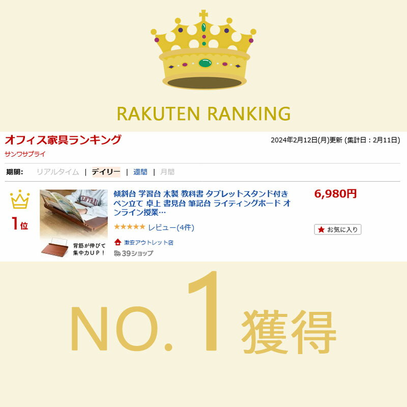 机の上に置くことで約10°の程よい傾斜を作り、学習時の姿勢を矯正できる卓上傾斜台。木製。子供の学習時の筆記台としての学習補助や、オンライン授業、リビング学習、読書での書見台としても使用可能。教科書やタブレットを立てられるスタンド、Apple Pencilや筆記用具などを置けるペン立て付き。<特長>●文字を読み書きするときに猫背になってしまうのを防ぐ、約10°の傾斜が作れる学習台です。●学習机やダイニングテーブル、リビングテーブルなどに置いて使うことで学習時の姿勢を改善し、体への負担の軽減と学習環境を整えます。●天板上部にはタブレットを立て掛けられる幅調整溝により、オンライン学習などでタブレットを見ながら手元でノートをとることができます。●付属のワイヤーを取り付ければ教科書を立て掛けることもできるので、教科書を見ながらノートをとることができます。●天板の横幅は約50cmあり、タブレットとA5ノートを横並びで置けるサイズに設計されています。●天板上部にはペンやタッチペンなどを立てられる構造です。●天板下部にはタブレットや教科書、ノートなどが滑り落ちるのを防ぐストッパー付きです。●トルク蝶番採用で、脚部分はゆっくりと開閉するので指はさみを予防し安全に使用できます。●脚部分を折りたたんで薄くできるので、省スペースに収納できます。●天板の角Rを大きく設計しているので、見た目にも柔らかい印象を与え怪我をしにくい形状になっています。<仕様>■サイズ:約W500×D350〜380×H45mm(折りたたみ時)■質量:約2.2kg■材質:MDF(表面PVCシート真空プレス)、天然木(脚部分)、ステンレス(ワイヤー)■耐荷重:5Kg■出荷形態:組立出荷■生産地:中国■保証期間:初期不良のみ■取扱説明書:なし<関連キーワード>子供 こども用 大人 学習 勉強 姿勢が良くなる 猫背 北欧 高さ調整 読書 テレワーク PC台 ノートPC台 ノートパソコン 在宅勤務 在宅ワーク 動画鑑賞 イージー オンラインレッスン タブレット台 文具 文房具 A4 ペントレー iphone12スタンド iphone12miniスタンド iphone12promaxスタンド iphone12proスタンド iphoneSE2スタンド iphone11スタンド iphone11proスタンド iphone11promaxスタンド iphonexsスタンド iphonexsmaxスタンド iphonexrスタンド iphonexスタンド iphone8plusスタンド iphone8スタンド ノートPC台 ノートパソコン台 ノートPCスタンド 200-STN065 サンワサプライ 4969887214534ラインナップ幅29cm角度調整幅50cm幅50cm幅54.8cm角度調整幅54.8cm角度調整幅56cm幅56cm幅70cm幅70cm