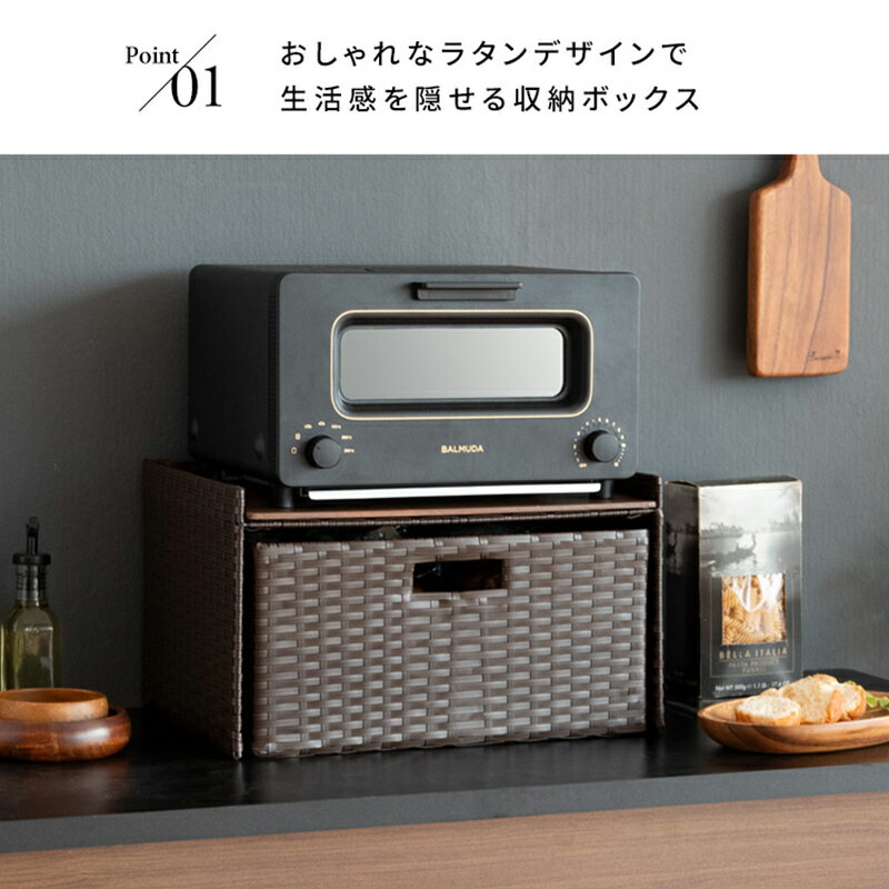 商品説明 キッチンでは雑多に置きがちなパンや調味料、洗面所やランドリー周りではタオル類などまとめて収納できるドロワーラック、Stire(スティーレ)。 収納物を隠してサッと取り出せる引き出しタイプで見た目もスッキリ。トースタも置ける天板でたっぷり収納できます。素材は水に強い丈夫な樹脂製ラタンで水周りでも安心。 カラーはアイボリー、ダークブラウンの2カラーからお部屋の雰囲気やお好みでお選びいただけます。 おしゃれなラタンデザインで、生活感を隠せる収納ボックス:素材感を活かしたラタン製ラックは収納したものが見えず、生活感を隠してホコリなどの侵入も防いでくれます。倒れやすい小物類もまとめて収納できるので、ペットのいたずら防止にもなります。 隠したいものをスッキリ収納。サッと引き出して取り出せるケース:サッとスムーズに引き出せる引き出しは、持ち手が両側にあるので持ち運びにも便利。引き出してそのまま食卓に持っていけるので、忙しい朝にも快適です。 パンや缶詰、タオル類などたっぷり収納できるラタンケース:深さが約17cmあり、食パンや缶詰も収納できます。底板付きで安定感もバツグン。完全に引き出せるので収納しているものが奥まで見やすく、ラクに取り出せます。 キッチンやランドリーなど、お家の色々な場所でマルチに活躍:キッチンに置けば、パンやシリアルなど収納できるブレッドケースに。ホコリや直射日光も防げて安心です。天板にトースターやポットが置けるので忙しい朝の準備もスムーズ。ランドリー周りでは、洗剤のストックや洗濯ネットなど洗濯用品の収納にピッタリ。バスタオルも入るサイズで、必要な時にサッと取り出せます。洗面所に置いて化粧水やメイク用品、タオル類など散らかりがちな小物類もスッキリ収納。水を弾く樹脂製ラタンで、水に濡れても安心です。 オーブントースターも置ける広々天板スペース:オーブントースターも置ける幅39×奥行29.5cmの広々天板は、木板付きで安定感があります。側面と背面に囲いがあるので、置いた物の落下を防げます。 軽量で水や傷に強い樹脂製ラタンと、しっかり支える木板とフレーム:丁寧に手編みされた樹脂製ラタンは軽くて丈夫なポリエチレン製。水や傷に強いので水周りにも最適です。通気性が良く、湿気がこもりにくいので食料品の保管も安心。側面上部はS字フックなどを使えば調理器具なども掛けられます。天板とケース底には、安定感のあるMDFの木板付き。全体の強度の高いスチールフレームが支えます。ケース側面にはスムーズに引き出せるフェルト付き。 お部屋の雰囲気やお好みで選べるカラー展開:明るく爽やかなアイボリーカラーは清潔感のあるお部屋を演出。シックなダークブラウンはお部屋を引き締めて落ち着きのある空間に。 商品サイズ (約)幅41×奥行30×高さ24cm 商品重量 耐荷重 天板:7kg 引き出し:3kg 仕様・材質 ポリエチレン、スチール(粉体塗装)、MDF(ラッカー塗装) 梱包 梱包サイズ:(約)幅42×奥行32×高さ26cm 梱包重量: 組み立て 完成品 検索語 DRK-400 ドロワーラック 送料無料 ファースト家具 ファーストカグ 新生活 入学 入学式 お正月 元旦 ゴールデンウイーク 夏休み 冬休み 年末 年始 クリスマス 誕生日 お誕生日 誕生祝い プレゼント 贈り物 ニューライフ 模様替え 友人用 プチギフト 送料込 送料込み スーパーセール スーパーsale お買い物マラソン 買い回り 楽天スーパーSALE お気に入り お気に入り商品 購入履歴 閲覧履歴 ランキング 格安 比較 評判 販売 簡単 扉 利便性 北欧 インテリア おしゃれ 無地 シンプル キッチン スリム デザイン ホワイト ダークブラウン ブラウン 白 茶色 おすすめ 通販 ラック 棚 収納家具 収納 キッチン収納 電子レンジラック レンジラック たっぷり収納 隠す デッドスペース 有効活用 ラタン製 ラタン