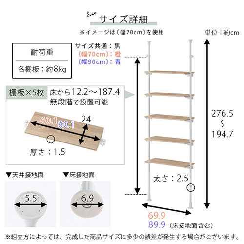 ■商品仕様 ※組み立て方によっては、完成した商品サイズに多少の誤差が発生する場合がございます。 材質 棚板:パーティクルボード(メラミン貼り)フレーム:スチール(粉体塗装)その他:ABS、PVC、PP 耐荷重 各棚板約8kg サイズ 〔幅70cm〕商品外寸:約幅69.9×奥行24×高さ194.7〜276.5cm商品重量:約11.5kg要組立品梱包サイズ:約幅105×奥行26×高さ13cm要組立品梱包重量 :約12kg個口数 :1 サイズ 〔幅90cm〕商品外寸:約幅89.9×奥行24×高さ194.7〜276.5cm商品重量:約13.5kg要組立品梱包サイズ:約幅105×奥行26×高さ13cm要組立品梱包重量 :約14kg個口数 :1 ■決済方法 クレジットカード 銀行振込(前払い) セブンイレブン(前払い) ローソン、郵便局ATM等(前払い) 後払い決済〔54,000円以上ご利用不可〕 代金引換〔100,000円以上ご利用不可〕 詳細はコチラ 関連キーワード突っ張りラック つっぱりラック 突っ張り式ラック つっぱり式ラック ウォールラック 壁面ラック ラック 収納ラック オープンラック ラダーラック ディスプレイラック スチールラック ランドリーラック 洗濯機ラック 洗濯機上ラック スリッパラック シューズラック キッチンラック フリーラック マルチラック 多目的ラック 木製ラック ウッドラック ごみ箱上ラック ごみ箱ラック ゴミ箱上ラック ゴミ箱ラック 冷蔵庫ラック サニタリーラック 5段ラック 五段ラック リビングラック ブックラック CDラック コミックラック コレクションラック シェルフ オープンシェルフ ラダーシェルフ ウッドシェルフ スチールシェルフ ウォールシェルフ ディスプレイシェルフ ランドリーシェルフ ブックシェルフ はしご 棚 台 本棚 収納棚 整理棚 つっぱり棚 突っ張り棚 飾り棚 ランドリー棚 間仕切り 仕切り 衝立 ついたて パーティション パーテーション パーティションラック パーテーションラック 収納 玄関収納 キッチン収納 台所収納 リビング収納 コミック収納 サニタリー収納 ランドリー収納 見せる収納 魅せる収納 小物収納 壁面収納 つっぱり収納 突っ張り収納 ツッパリ収納 洗濯機収納 洗濯機上収納 すき間収納 すきま収納 隙間収納 ゴミ箱上収納 突っ張り つっぱり ツッパリ 突張り 突っ張り式 つっぱり式 突っ張り型 つっぱり型 突っ張り棒 つっぱり棒 木製 木目 木 ウッド メラミン 5段 五段 棚付き 可動棚 可動 可動式 棚板 高さ無段階 無段階調整 高さ自由 スチール 粉体塗装 省スペース 狭い スリム 薄型 薄い 段差対応 隙間 すき間 すきま 取り付け 天井 床 壁 傷つけない 転倒防止 背板 なし 約 幅70cm 奥行25cm 70cm幅 幅90cm 90cm幅 高さ 200 210 220 230 240 250 260 270 cm 2m 高さ195〜276cm 高さ調節 高さ調整 伸縮 伸縮タイプ 伸縮自由 伸縮自在 無段階 伸縮式 ゴミ箱上 ごみ箱上 冷蔵庫上 洗濯機上 デッドスペース 有効活用 キッチン ダイニング 台所 リビング ベッドサイド 寝室 デスク 横 デスクサイド 書斎 ランドリー 洗面所 脱衣所 子供部屋 子ども部屋 こども部屋 玄関 エントランス 廊下 店舗 ショップ オフィス 事務所 賃貸 マンション アパート 向け 新生活 引っ越し 引越し 一人暮らし ひとり暮らし 1人暮らし ゴミ箱 ごみ箱 ダストボックス 本 漫画 マンガ まんが コミック コミックス 単行本 文庫本 a4 雑誌 CD DVD 小物 観葉植物 雑貨 キッチン雑貨 キッチン小物 調理器具 スパイス 調味料 洗濯機 洗剤 鞄 かばん バッグ 帽子 靴 クツ くつ シューズ スリッパ 収納家具 整理 整理整頓 マルチ ディスプレイ ウォールナット ウォルナット ブラウン ダークブラウン 茶色 こげ茶 こげ茶色 黒色 オーク ナチュラル ベージュ ホワイト 白色 白い 白家具 シンプル 可愛い かわいい かっこいい 格好いい カジュアル モダン 塩系 インダストリアル 北欧 韓国 風 インテリア おしゃれ オシャレ お洒落 サンキュークーポン対象 サンキュークーポン獲得 サンキュークーポン券 サンキュークーポン付 gekikagu bonkagu\ Thank You!! /累計出荷数5,598突破!※ 2022年9月12日から2025年8月13日までの弊社累計販売実績に基づく ページの上へ戻るカラー詳細商品サイズ
