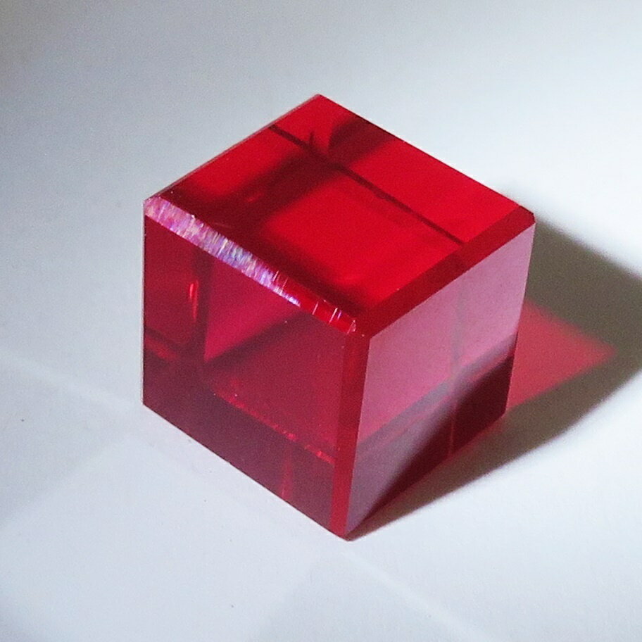 商品情報素材合成コランダム(赤色 合成ルビー)Al2O3 Cr着色合成石サイズ10x10x10mm 六面体約3.8g (19ct)※寸法重量には若干の個体差があります。注意モニターの発色、周囲の環境などで若干色味が異なって見える場合がございます。素材、結晶の性質により、紫外線の有無、方向によっても色は変化します。GemKana/ジェムカナ/合成ルビー/10mmキューブ 合成石 四角 さいころ 立方体 六面体 鮮やかな赤色と強い表面反射をもつ素材をキューブ型にしました。1cmの立方体。ベルヌイ法合成ルビーを使用。各辺はファセットをつけてあります。頑丈な素材です。耐熱1700度。銀粘土などへの組み込みも可能です。 10