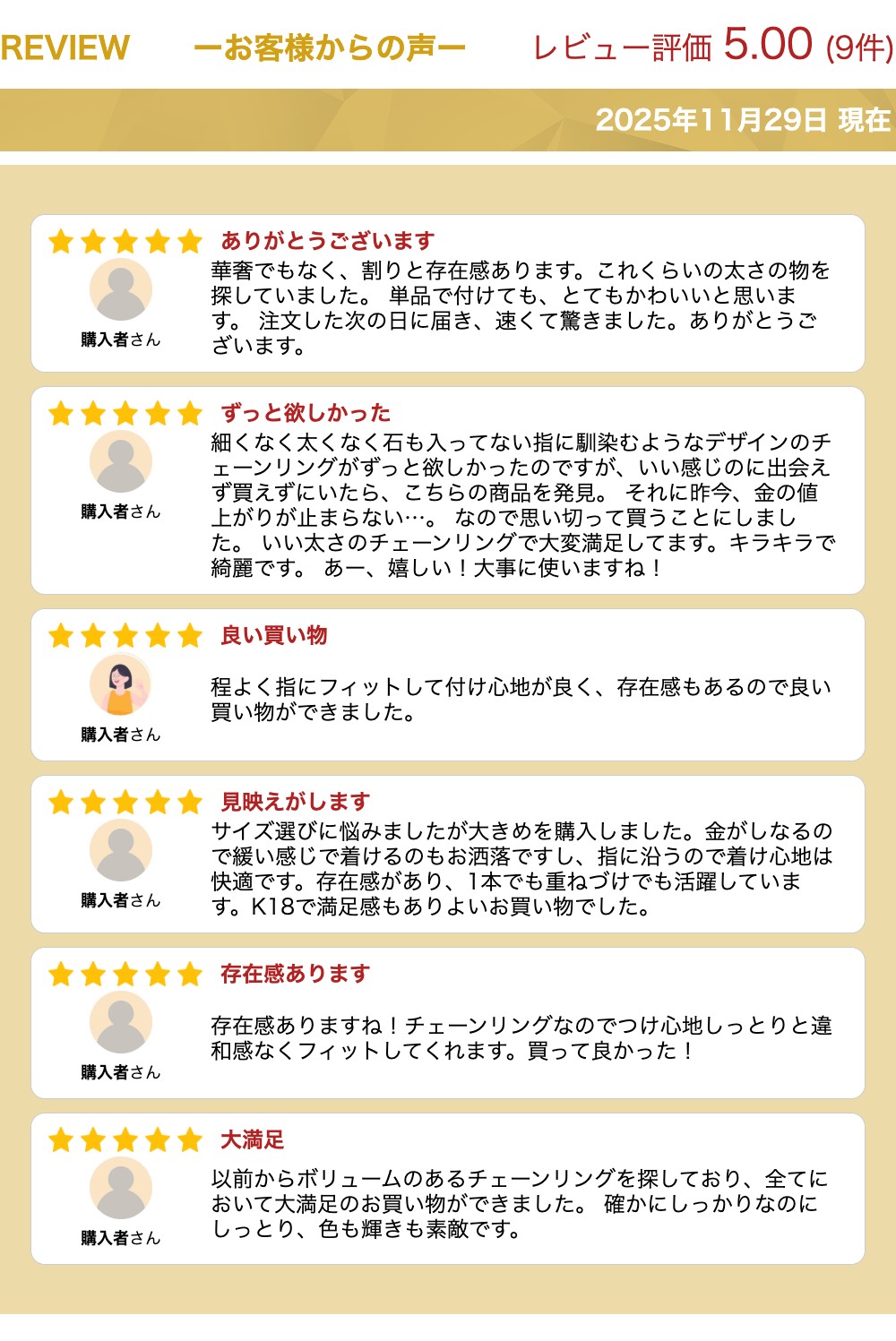 K18 ホローチェーン リング #K18 #リング ホローチェーンを存在感あるリングへとお仕立てしました。イタリアンジュエリーを思わせるゴージャス感が魅力です。地金にはたっぷりとK18を使い、シンプルでありながら素材にこだわりました。お持ちのリングと合わせて使うのも◎。シンプルだからこそジュエリーを引き立てるリングです。ゴールドジュエリーの魅力をお楽しみいただけます。 商品詳細 素材 K18イエローゴールド サイズ 9号 外径:約18.30mm 内径:約14.10mm 11号 外径:約18.50mm 内径:約14.60mm 13号 外径:約19.50mm 内径:約15.40mm 15号 外径:約19.80mm 内径:約15.90mm 17号 外径:約20.60mm 内径:約17.20mm ※幅はすべてのサイズ約4.10mm 注意書き ・ 天然石やパールを使用している商品は、素材の色や柄など一つ一つ特徴が異なる場合がございます。 ・ ダイヤモンドを使用している商品は、ダイヤモンドの直径サイズやカラー、内包物などの特徴に多少の個体差がある場合がございます。 ・ フープピアス以外のピアスにはシリコンキャッチが付いています。(ただし一部商品除く) ・ モニターの発色の具合によって実際のものと色が異なる場合がございます。 対応サービス ギフトラッピング こんなシーンにもおすすめ! ギフト・プレゼント・贈り物・ご褒美・自分用・普段着・普段使い・通学用・通勤用・旅行・パーティー・ イベント・デート・ディナー・お出かけ・サプライズ・サプライズプレゼント・誕生日・誕生日プレゼント・ホワイトデー・ お返し・母の日・還暦祝い・還暦・出産祝い・出産・ギフト・卒業祝い・成人式・成人祝い・内祝い・進学祝い・ 卒業祝い・就職祝い・内定祝い・婚約祝い・結婚祝い・敬老の日・記念日・結婚記念日・結婚記念・退職祝い・レディース・母親・ハロウィン・敬老の日・秋分の日 関連商品★20%OFFクーポン配布中★K18 プレート リング イエローゴー...★20%OFFクーポン配布中★K18 イエローゴールド、ホワイトゴール...★20%OFFクーポン配布中★K18 イエローゴールド/ホワイトゴール...27,500円39,600円42,900円★20%OFFクーポン配布中★K10 イエローゴールド、ホワイトゴール...★20%OFFクーポン配布中★★NEW★ K18 スターカット ヴィン...★20%OFFクーポン配布中★K18 イエローゴールド コイン ネック...46,200円31,900円58,300円★20%OFFクーポン配布中★K10 イエローゴールド、ホワイトゴール...★20%OFFクーポン配布中★K10 イエローゴールド 合成オパール ...★20%OFFクーポン配布中★K18 イエローゴールド オーバル フー...24,200円25,300円22,000円★20%OFFクーポン配布中★K18 イエローゴールド スクリューチェ...★20%OFFクーポン配布中★K18 イエローゴールド/ホワイトゴール...★20%OFFクーポン配布中★K18 イエローゴールド ブレスレット ...42,900円42,900円45,100円