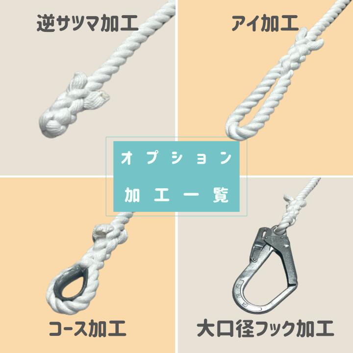 北海道・沖縄・離島へのお届けは別途送料が発生します。事前にご連絡ください。 ◇用途に合わせてロープの『太さ』と『長さ』が選べます。◇ 【特長】 ●(株)クラレの原糸を使用した安心の日本製。 ●高強力で耐候性(紫外線による劣化が少ない)に優れる上、アルカリ酸に強いロープです。合成繊維の中で最も親水性があるビニロンをメインに使用しています。 ●クロスロープはエイトロープとも呼ばれ、8本撚りのストランドを2本1組にして撚り合わせるクロス編みにすることにより、三ッ打でトラブルになり易いキンク(ねじれ)を解消しています。 ●耐摩耗性に優れ、柔軟で取り扱いがし易いロープとして様々なシーンで使用されております。 【用途】 ●林業、建設業、漁業、海洋業、ケーブルの通線作業、船舶向け係留用、アンカーロープ等 ♦材質:クレモナS(ビニロン60%、ポリエステル40%) ♦仕様:クロス(8打) ♦色:白 たくさん使う方向けのお得な定尺品。 →【定尺】品はこちら 出荷目安:3営業日以内 ◇端末加工も承ります!◇ 用途に合わせて、端末加工のオーダーも可能。 「両端アイ加工」「片側のみフック加工」など自由度大! (通常カット品は端末テープ止めです。) 端末加工(有料オプション)は4種類よりお選びいただけます。 逆サツマ加工:末端を折り返し編み込むほつれ止め加工。猫あし加工・バックスプライスとも呼ばれます。 アイ加工:端末に輪(アイ)を作り編み込む加工。さつま加工・アイスプライスとも呼ばれます。 コース加工:キツネコース(ロープコース)を組み込む加工。アイ部を保護することで接触面の摩耗を防ぎ、ロープの寿命を高めます。 フック加工:フックを組み込む加工。藤井電工製の大口径フックを使用します。(※ロープ径9mm~18mmのみ選択可能です。) クレモナクロスロープ (8打)の太さ・長さを選べる!・ロープの太さ:6mm × 長さ:1m〜50mまで ・ロープの太さ:6mm × 長さ:50m〜200mまで ・ロープの太さ:8mm × 長さ:1m〜50mまで ・ロープの太さ:8mm × 長さ:50m〜200mまで ・ロープの太さ:9mm × 長さ:1m〜50mまで ・ロープの太さ:9mm × 長さ:50m〜200mまで ・ロープの太さ:10mm × 長さ:1m〜50mまで ・ロープの太さ:10mm × 長さ:50m〜200mまで ・ロープの太さ:12mm × 長さ:1m〜50mまで ・ロープの太さ:12mm × 長さ:50m〜200mまで ・ロープの太さ:14mm × 長さ:1m〜50mまで ・ロープの太さ:14mm × 長さ:50m〜200mまで ・ロープの太さ:16mm × 長さ:1m〜50mまで ・ロープの太さ:16mm × 長さ:50m〜200mまで ・ロープの太さ:18mm × 長さ:1m〜50mまで ・ロープの太さ:18mm × 長さ:50m〜200mまで