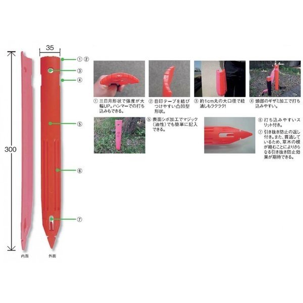 1.三日月形状で強度が大幅UP。ハンマーでの打ち込みもできる。 2.目印テープを結びつけやすい凸凹型形状。 3.約1cm丸の大口径で紐通しもラクラク! 4.頭部のギザミ加工で打ち込みやすい。 5.表面シボ加工でマジック(油性)でも簡単に記入できる。 6.打ち込みしやすいスリット付き。 7.引き抜き防止の返し付き。また、貫通しているため、草木の根が絡むことにより、さらなる引き抜き防止効果が期待できる。 【仕様】 サイズ:35×4×300mm/200本入 重量:約0.05kg/本