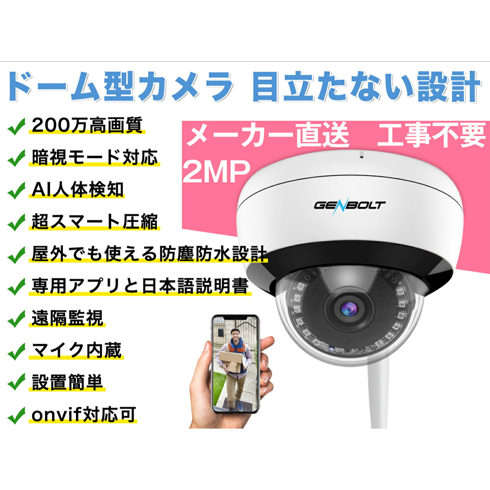 -当店でご購入された商品は、原則として、「個人輸入」としての取り扱いになり、日本からお客様のもとへ直送されます。 -一部商品は国内の提携先倉庫から配送されます。 -商品お届けまでに、海外からの配送は1〜3週間程度、国内配送の場合は1〜3日程度かかります。 -個人輸入される商品は、すべてご注文者自身の「個人使用・個人消費」が前提となりますので、ご注文された商品を第三者へ譲渡・転売することは法律で禁⽌されております。 -関税・消費税が課税される場合があります。詳細はこちらご確認下さい。 -国内配送の商品は国内でのお買い物と同じく消費税が発生いたします。関税はかかりません。 商品情報 ※AI人体検知 木や葉や動物や車等動体が動いても、警告は反応しません。監視範囲内に、人体の形を自動的にフォローして、動き状況が把握できます。※高画質200万画素 GENBOLTの防犯カメラは200万画素の高性能CMOSセンサーを搭載し、フルハイビジョン画質で撮影できます.※超スマート圧縮 高画質のままSDカードの容量を節約超スマート圧縮方式を採用し、JPEG写真の同時撮影にも対応より安定した映像を撮影できます。従来より50〜60%の容量節約になり、より長時間の記録を残せます。※動体検知範囲を自由に設定 動体検知の範囲を設定でき、誤警報を減らせます。無駄な警告に煩わされません。木や葉が動いても、警告は反応しません。IEブラウザやアプリを通じて、エリアを設定します。※スマートアラート 動体検知が反応したとき、すぐに警告のメッセージがスマホにプッシュ通知され、メールで1〜3枚の撮影写真が送信されます。またFTP機能でサーバーに。ビデオと写真をアップロードできます。※プライバシー保護 カメラには最新のチップを搭載し、軍用レベルの暗号化技術を実現しましたセキュリティは4重に保護され、ユーザーのプライバシーを確保します。保障1:プラットフォーム+ユーザー二段階認証によるセキュリティ設定保障2:オンラインバンキングに匹敵するレベルのRSA暗号化通信で第三者からの盗み見を完全防御保障3:SSLによるデータ転送の暗号化;保障4:厳格なユーザー行為のセキュリティ保護.※豊富な録画モード 常時録画:SDカードの容量がいっぱいになったら、古いデータから上書き録画します動体検知録画:動体検知で不審な動きを検出した場合に録画し、動体検知で不審な動きを検出した場合に録画し、またAPP警報やEメール等の通知アラーム機能も設定できます。スケジュール録画:予約録画時間を設定し、指定した時間帯にのみ録画することが可能です。複数ユーザーで同時に視聴可能 様々な機器で視聴できますGENBOLT CAM のアプリは、最大64台のカメラを管理できます。1台のカメラを、最大5人で同時に視聴することができますタブレット、スマホ、PCなど、あらゆる機器で視聴できます※電波法技適認証&PSE認証 GENBOLT ネットワークカメラ: 1,電波法技適認証番号:R210-124040、弊社のこの監視カメラは技適マークを取得し、安心で安全な防犯カメラを提供します。2,弊社のこのカメラは権威機関ULに直流電源装置のテストを受けて、PSE認証も取得し、PSE認証番号:TKY220116-AC 16 01 013※品質保証 監視カメラは12ヶ月のサービス保証期限があります。14日間返金保証,終生技術の支持。詳細な説明書とアプリは弊社のホームベージwww.genbolt.com/downloadにアクセスしてダウンロードするようお願いします。何か不明点があれば、お気軽にお問い合わせください。連絡先:jp@genbolt.com, LINE:GENBOLT電話番号:+81 50-5840-2687(月曜日〜金曜日10:00 - 19:00)※カメラ仕様 1.画像センサー:1/3 " CMOS2.画像解像度:200万画素3.レンズ:2.8mmレンズ 110°広角視野4.赤外線暗視距離:30メートル5..ミニマム照明:0ルクス(IRオン)6.電源供給 入力:DC12V-1000mA、出力:100-240V7.128G TFカードをサポートします.8.無料の高品質アプリ GENBOLT CAM9.技術基準適合証明書取得済PSマークの種類:pse届出事業者名:株式会社 泰成商事登録検査機関名称:UL JAPAN包装仕様 1*200万画素 IPカメラ;1*3メートル電源アダプター(12V/1A);1*1メートルネットワークケーブル;1*ネジバッグ、1*英語と日本語の取扱説明書 検索キーワード:防犯カメラ ワイヤレス 屋外 工事不要 監視カメラ WIFI 室内 GENBOLT 店舗 玄関 車庫 車上荒らし スマホ 家庭用 業務用 一戸建て 不審者 格安 会社 室内 長時間録画 車 バイク 自転車 天井 安い セキュリティ 介護 外出防犯対策 盗難防止空き巣 家庭 自宅