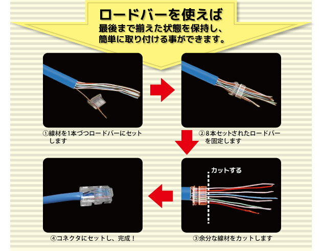 メーカー希望小売価格はメーカー商品タグに基づいて掲載しています ------------------------------------------------ ■□こちらはメール便発送商品です□■ お急ぎや宅配便希望の方は購入画面で宅配便をご選択下さい。 後ほど送料は別途追加されます。 宅配便を希望の方は購入画面で配送方法を必ず宅配便に変更をして下さい。 宅配便のご選択がない場合は自動で送料無料のメール便での発送となります。 メール便での発送の場合は日時指定配送が出来ませんので、予めご了承下さい。 出荷時に全検査しておりますので疎通が取れない場合以外はクレームの対象外となります。 メール便許容数を超えての複数口ご購入頂くと自動的に宅配便配送に変更されます。 ------------------------------------------------ 商品詳細 【 仕様 】 ● セット内容:コネクター・ロードバー ● 入り数:50個セット ● インターフェイス:RJ-45コネクタ ● 対応伝送帯域:Cat5e ● プラグタイプ: 8P8C(8極8芯) ● 対応ケーブル:単線/より線共用、AWG24-26 ● ロードバー付き:◯ ● 爪折れ防止加工:◯ ● 24金メッキピン:◯ 【 説明 】 ● LANケーブル自作用、カテゴリ5e対応 RJ-45コネクタ(モジュラプラグ)です。 ● ロードバーを使うことで最後まで揃えた状態を保持し、簡単に取り付けることができます。 ● 自作でLANケーブルを作成する方・PCメンテナンス・オフィスでの大量使用に最適です。 ● 24金メッキピンを使用。ケーブルの抜き差しもしやすく、耐久性にも優れています。
