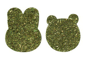【キャッチコピー】アルファルファを固めた動物のお顔の形の可愛いおもちゃ!【商品特徴】アルファルファをうさぎやハムスターの形に固めて作った天然素材のおもちゃです。(米でんぷんで固めています。)ハムスター、うさぎ、モルモットなどの小動物が楽しくかじってストレス解消にピッタリです。歯の伸びすぎ防止にも。【材質/素材】アルファルファ、米デンプン【原産国または製造地】中国【商品使用時サイズ】50×50×10mm【使用方法】・本品を飼育ケージの床敷の上においてご使用ください。【諸注意】・本品は小動物専用です。他の目的には使用しないでください。・火気や暖房器具のそばに置かないでください。火災などの原因になります。・お子様の手の届く場所に置かないでください。・本品は防虫剤を使用しておりません。季節や保管場所により虫が発生することがあります。・本品は天然素材を使用した手作り商品のため寸法、重量などが異なる場合があります。・天然素材を使用しています。季節によって色が異なることがあります。・防カビ、抗菌シート(天然成分由来)を同梱しております。誤ってペットに与えないようにご注意ください。