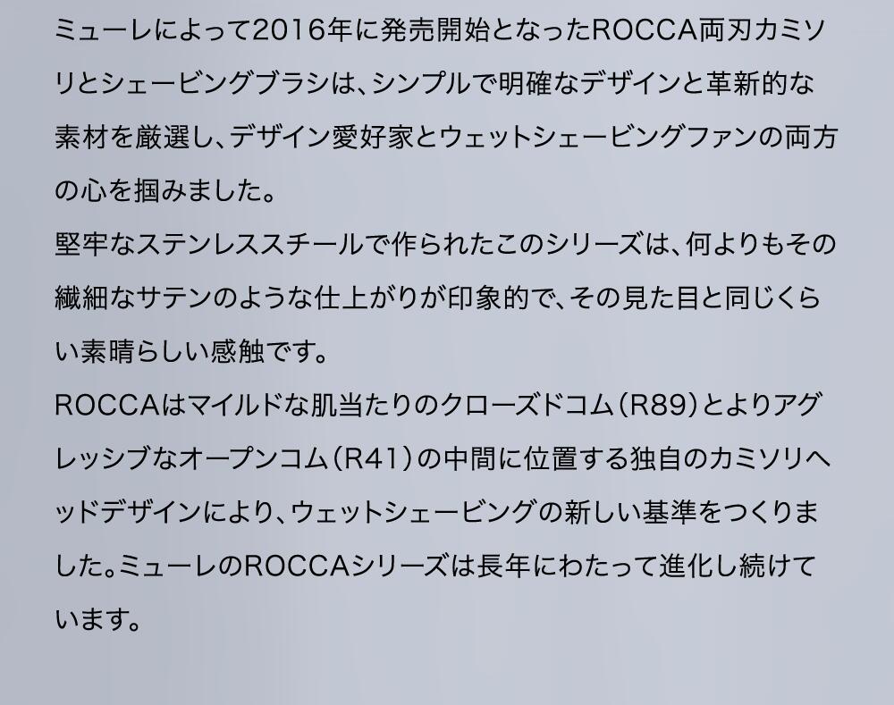 直線的なデザインと滑らかなステンレススチールの素材感が織り成す ”クール&エレガンス” な佇まい。ミニマルなシルエットが美しい ROCCA(ロッカ) シリーズ。直線的なデザインと滑らかなステンレススチールの素材感が織り成す ”クール&エレガンス” な佇まい。ミニマルなシルエットが美しい ROCCA(ロッカ) シリーズの両刃カミソリ。ステンレススチールを使用、耐久性があり頑丈です。サテン仕上げをを施した表面は上質感があり、美しく暖かみを感じます。 ハンドル部分の ”ハニカム(蜜蜂の巣)デザイン” は持ちやすく、よく手に馴染みます。 << PVDコーティング >> R96JETの両刃カミソリは、強度か高いステンレスチール素材に、さらに PVD コーティングを施し、スタイリッシュに仕上げております。 時計の外装などに使用されているPVDコーティングは、耐久性に優れて、外観をエレガントに美しく保ちます。 カミソリヘッド:クローズドコム(ROCCA仕様) サイズ:41 mm x 105 mm 重量:80 g