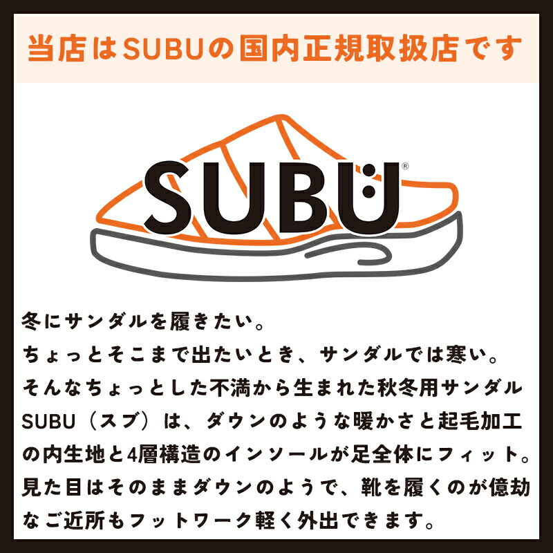 メーカー希望小売価格はメーカー商品タグに基づいて掲載しています。SUBU ウィンターサンダル「DOTS COLLECTION HORROR 2025」 暖かい冬用サンダルSUBU(スブ)編み模様が特徴的な2025新モデルDOTS HORROR 2025 「誰も知らない冬のサンダル」をコンセプトに発売されたSUBU。 寒い時期、ふと出掛ける時に素足で履ける、いままでにない秋冬のサンダル。ダウンのような暖かさで素足をつつみ込み、起毛加工の内側の生地と4層構造のインソールが、足全体に抜群のフィット感を生み出し、優しい履き心地をつくりだします。 近所へ買い物に行ったり、ゴミ出しや車へ何か物を取りに行くなど、すぐに家に戻るのに、寒い外で普通のサンダルや素足はとても苦痛。そのような時、SUBUは寒い冬でも暖かく足を包み込み、裸足のままでも外に快適に出る事ができます。ちょっとしたお出かけにはもちろん、お部屋での室内シューズとしても◎ 保存袋が付属されていますので、旅行時のサブシューズとしても活躍してくれます。暖かくて優しい。いつでもどこでも、あなたをリラックスさせてくれるサンダルです。 ≫SUBUのその他の商品は【こちら】 寒い時期、ふと出掛ける時に素足で履ける。いままでにない秋冬のサンダル。 【バイヤーおすすめポイント】 1.まるで履くダウン。ボリュームたっぷりの中綿で素足を暖かく包み込む。 2.4層構造のインソールと起毛した内側の生地で抜群のフィット感。 3.スニーカーのように厚みのあるソールはすべり止めも付いていてお出かけでも歩きやすい。 【サイズ感】表示通りのサイズで選んでいただいて大丈夫です。新品はややきつく感じるかもしれませんが、馴染むとソールが少し沈むためちょうど良いフィットになります。 【商品仕様】 素材 アッパー:ナイロン 裏生地:ポリエステル 生産国 made in China ご注意点 ※画面上の色と実物の色は若干違って見える場合がございます。 【サイズスペック】 サイズ cm 0 22-23.5cm 1 24-25.5cm 2 26-27.5cm 3 28-29.5cm (cm) ※個体差につき1cm前後のズレはご了承ください。 ≫【採寸について】サイズガイドはこちら