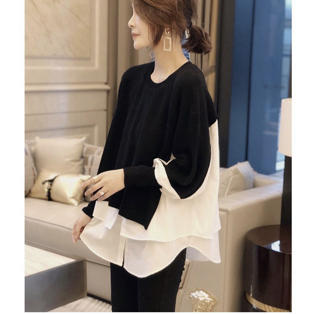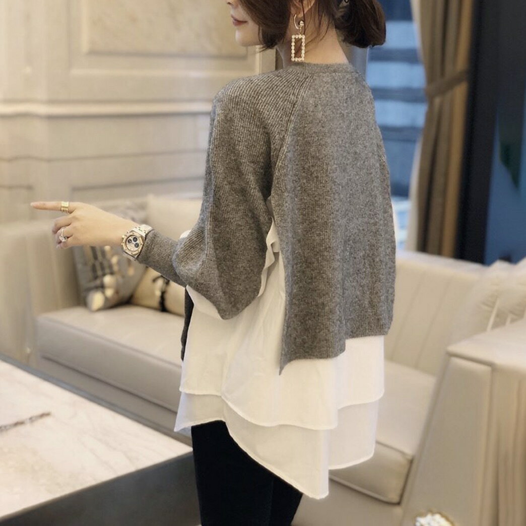 長袖 秋 秋冬 冬 ニット ブラウス トップス ドッキング 切替 きれいめ 体型カバー 通勤 上品 ホワイト ブラック グレー 白 黒 OL オフィス カジュアル 20代 30代 40代 オフィスカジュアル