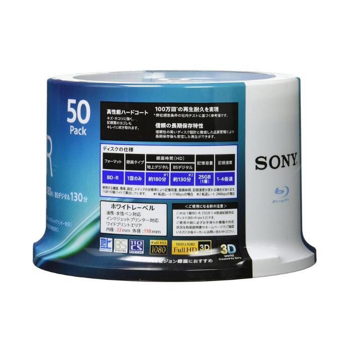 ブルーレイディスク ソニー sony BD-R 25GB 1回録画用 50枚入り 4倍速ダビング対応 ケース無し 50BNR1VJPP4 ハードコート Blu-ray Disc ダビング 長期保存 インクジェットプリンター対応 映像 ディスク 映像用