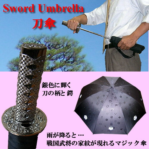 オススメ商品 日本のトランプ・おもちゃ 花生け・時計 お寿司のグッズ ギフトスプーン 彫金(ちょうきん)小物 マウスパッド 外国人が喜ぶ日本のおみやげ、 海外留学・ホームステイのホストファミリーへのお土産、 海外出張の海外取引先への手土産、 海外生活でお世話になった方へのプレゼント 、 海外から来られたお客様への贈り物 を豊富に取り揃えております。 ホームステイをもっと楽しく!海外取引をもっとスムーズに! 京都シルク株式会社は、 ホームステイをされる方、 海外進出企業様、海外で活躍する日本人のサポーターです。家紋が浮き上がる刀型傘(日本刀の形をした傘)折り畳み式刀傘 面白ユニーク! 粋でお洒落な忍者刀傘 持ち手もリアルな日本刀にそっくり! 部屋に飾れば日本刀傘。 手に持って歩けば侍刀傘。 肩に背負えば忍者刀傘。 雨が降れば便利な折り畳み式傘。 折り畳み式なので、軽くて持ち運びに便利。 リュックのサイドポケットにも入るコンパクトサイズ。 刀を鞘から抜くように持ち手を伸ばせば、あっという間に雨傘に早変わり。 まわりの人たちも拍手喝采。 みんなの笑顔を誘います。 そして・・・ 雨に濡れるとあら不思議? 戦国武将の家紋が浮き上がってくるマジック傘。 雨の日が楽しくなる刀型雨傘。 晴れた日は日傘にもなります。 実用的で日本的。 刀型傘を持って参上すれば、もうあなたは人気者! 遊び心たっぷりの日本刀型傘は、みんなを笑顔にさせます。 侍・忍者気分が味わえると海外でも話題騒然。 銀色に輝く持ち手と鍔は、本物そっくり。 刀の鍔はドラゴン龍の模様。 侍刀をモチーフにした折り畳み式傘 Sword Umbrella. 日本のお土産、ホームステイのお土産、外国人へのプレゼントとしても喜ばれています。 セット内容 刀型傘1本 刀傘袋(騎馬武将の模様入り)1個付き 写真に写っているバッグは含まれません。 サイズ 折り畳み時 全長 35cm 刀の鍔 8cm 伸ばした時 全長 67cm 刀の持ち手 12cm 開いた時の直径 98cm 親骨 鉄/亜鉛メッキ 約55cm x 8本骨 中棒 鉄/亜鉛メッキ 持ち手・鍔・ポリプロピレン樹脂(銀色) 開閉 安全ストッパー式 傘生地 ポリエステル100% (黒) 刀傘袋 ポリエステル100% (黒) 重さ360g 男女兼用 持ち歩く時は本物の日本刀と間違われないようにご注意ください。