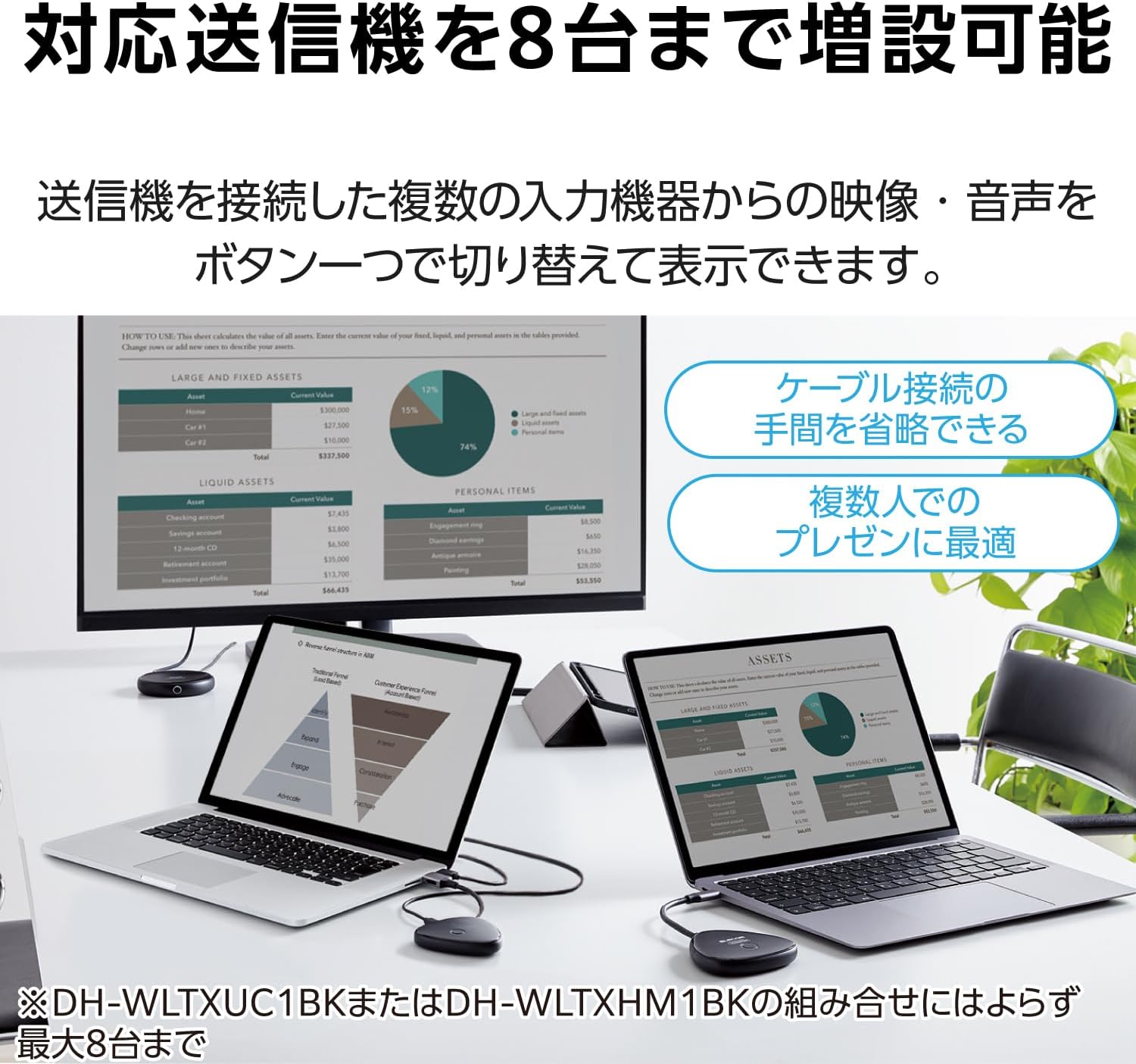 ◇商品特徴 〜映像・音声のワイヤレス送信を行うワイヤレスHDMIエクステンダー(送信機)〜 ● DH-WLRX1BKのワイヤレスHDMIエクステンダーの受信機と組み合わせてご使用ください。 ● 最大4K30Hz(3840×2160 30Hz) までの解像度の映像データを送信することが可能です。 ● 最大8台までの送信機を1台の受信機にペアリングして増設できます。 ● 組み合わせによらず、DH-WLTXUC1BKまたはDH-WLTXHM1BKの各ワイヤレスHDMIエクステンダーの送信機を最大8台までペアリング可能です。 ● HDCP 1.4対応により、放送波や映画などの著作権保護コンテンツにもご利用できます。 ● パソコンご利用時は、ミラーリング・マルチディスプレイのどちらの出力画面設定でもご利用いただけます。 ● HDMIコネクター端子には金メッキ加工をしており、サビに強く信号劣化を防ぎます。 ● 給電用USBケーブルを同梱しています。(信号ラインには対応していません) ◇製品仕様 項目 説明 主な入力対応解像度 4K(3840×2160)/30Hz、2K(1920×1080)60Hz、1080p/720p/576p/480p HDMI規格 HDMI1.4 HDR 非対応 対応映像出力機器 HDMI出力端子を搭載したAV機器・家庭用ゲーム機・メディアストリーミング端末・パソコンなど 最大ペアリング台数 8台 コネクター形状 映像入力:HDMIケーブル(プラグ)×1(ケーブル長 約12cm)電源入力:USB Type-Cコネクター(ポート)×1 HDCP HDCP1.4 CEC 非対応 HEC 非対応 ARC 非対応 無線周波数 5.2GHz(5.15〜5.25GHz) 最大伝送距離 15m(障害物のない状態) 伝送遅延 最大150ms 設置条件 屋内専用 適合規格 技術基準適合証明(認証番号:018-230213) 給電ケーブル USB-A - USB Type-Cケーブル(約1.2m、コネクター含まず) サイズ 幅約82mm×奥行約80mm×高さ約14.5mm 材質 樹脂 カラー ブラック 重量 約65g(本体) 消費電力 最大4.5W(5V/0.9A) 付属品 給電ケーブル 使用温度・湿度 温度0〜40℃、湿度10〜85%(結露なきこと) 保存温度・湿度 温度-10〜60℃、湿度5〜85%(結露なきこと) 保証期間 1年間