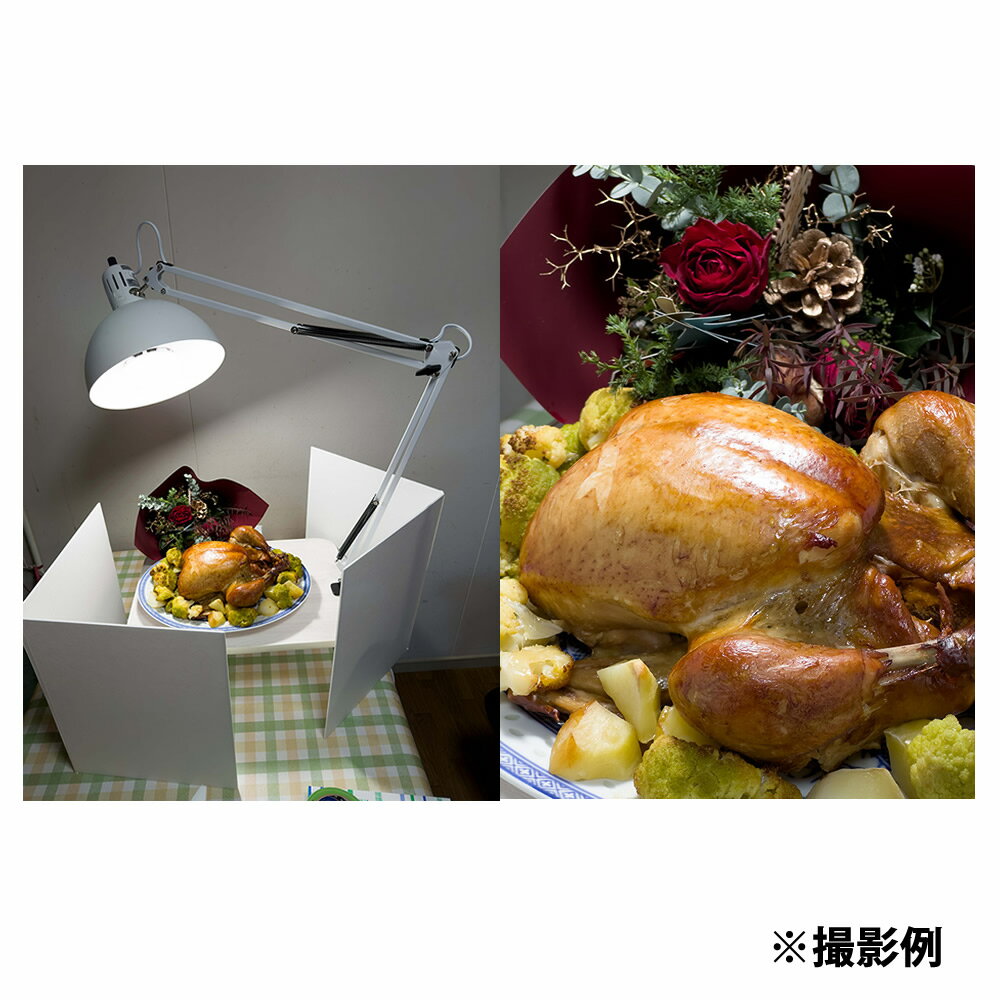 本体材質 スチール(クランプ部アルミ、一部プラスチック) アーム 各500mm (2本) セード 直径250mm 高さ140mm クランプ 本体:68mm ネジ部93mm はさみ可能幅約50mm 製品全体重量 1,350g (クランプ約120g フード約480g アーム約750g)(LEDランプ別売は含まれていません) ソケット部 直径65mm 高さ110mm(含むスイッチ) ACコード 2,200mm ランプ口金 E26 対荷重 380g(これ以上重いランプは使用できません) 使用場所 屋内のみ(ウオータープルーフではありません) アーム稼働範囲 トップ、サイドとも約700mm(クラランプ設置上部から) 推奨LEDランプ ブランド名:039 Sh-50Pro-SまたはSh-50Pro-V ※Sh-50Pro-Vはスマホのアプリで出力を調光できるタイプのランプです。(色温度は調整できません) 製品特徴※各部品の重量、サイズはおおよその値です アームライトGは動画や写真撮影の本格的ライティングを、テーブルやデスク上で簡単迅速に行うために開発されたアームライトです。 アームライトGに039ブランドのLEDランプを装着することにより、大光量(写真電球約300W相当)で太陽に近いキレイな光(演色評価指数97以上)で撮影ができます。 瞬間光ではなく定常光のため、プロ用カメラからスマートフォンまであらゆる撮影機材に対応できます。 039LEDランプの形状が今では少なくなった丸型のランプのため、フラットなLEDランプでは苦手な光のグラデーションなどメリハリのあるライティングも可能です。 AC入力も通常の100Vタイプのため場所を選びません。 店舗やオフィスの片隅でちょっとした空いた時間に気軽に動画や写真の撮影が可能です。 特別な工具を使用せず撮影の準備と後片付けができます。 ※LEDランプは別売です。 ※商品画像の本製品以外は含まれません。 ※商品詳細画像は色違いを使用しています。 注意:モニターの発色具合により実際のものと色が異なる場合がございます