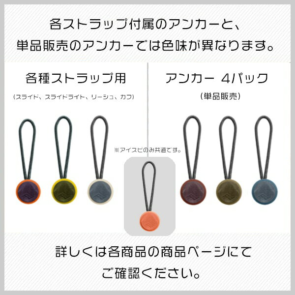 アンカーサイズ Φ1.7cm ループ部分長さ 4.3cm 重量 2g(1個) 耐荷重 90kg 製品特徴 Peak Designを代表するアンカーのNEWカラー( 4 個セット)です。 ※各ストラップ付属のアンカーと、単品販売のアンカーでは色味が異なります。詳しくは各商品の商品ページにてご確認ください。 ■注意■ 併売品となりますのでご注文のタイミングによっては在庫がご用意できかねる場合がございます。予めご了承下さい。 モニターの発色具合により実際のものと色が異なる場合がございます。