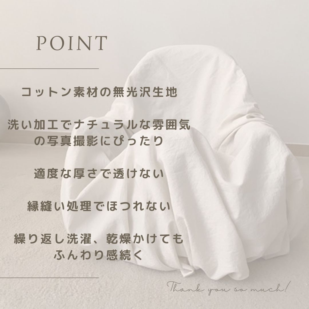 商品情報素材/材質コットン100%サイズ/寸法150cm×150cm注意モニター発色の具合により色合いが異なる場合がございます。背景布 背景隠し 白背景布 ナチュラル色布 布 背景隠し ハーフバスデー インスタ映え お家スタジオ 150×150 テーブル布 バンボ椅子カバー ピクニックシート シンプル布 撮影小物 ナチュラル布 シワが付きにくい布 誕生日飾り付け 韓国子供用品 育児がもっと楽しくなる「giyomi」 使い方無限の撮影布です。ナチュラルカラーで光沢がないウォッシュ加工のコットン生地です。ねんね撮影も、背景隠しも、テーブル布やバンボ椅子にかける用まで。使い方無限なので、1枚あると使う場面が多いかと。150cm×150cm★生地幅ギリギリで布をカットしているため、生地端の印である針穴が端にある場合があります。ただ、縫ってあるので表にこの針穴が見える事なく、裏側に少し残っている物もあります。不良ではなく、生地幅目一杯使っているからですので、ご了承ください。 2