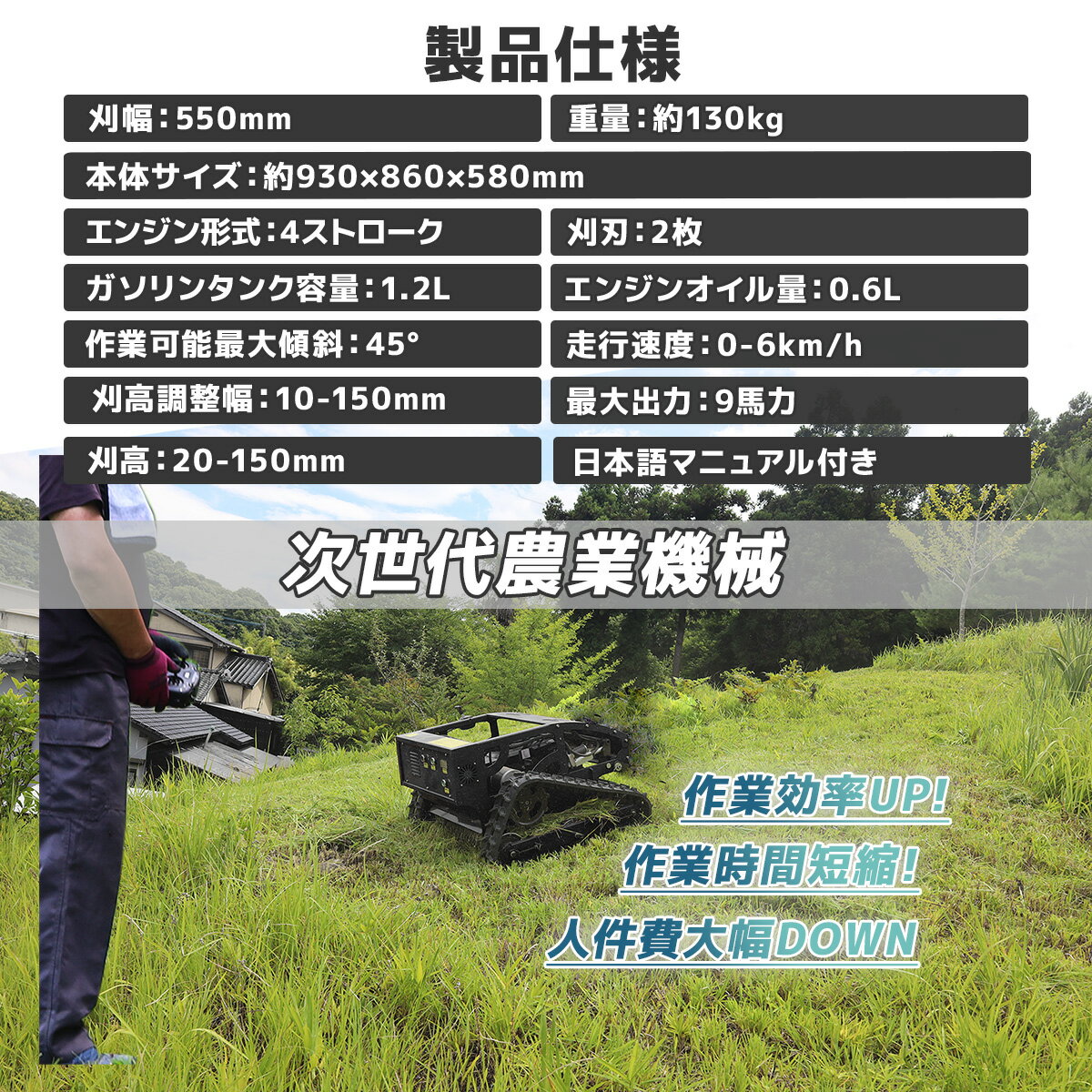 ◆商品詳細 遠隔操作が可能な高性能リモコン式草刈機です。 全ての機能をお手元のリモコンで操作できて最大1500mまでの通信が可能! 危険な場所の作業でも安全な場所から操作が行えます。 前進時でも後退時でも草刈り出来て最大傾斜は45°までOK! 本体サイズ:約930×860×580mm 重量:約130kg 刈幅:550mm 刈高:20-150mm 走行速度:0-6km/h 速度調整:無段階 作業可能最大傾斜:45° 最大出力:9馬力 エンジン形式:4ストローク 刈刃:2枚 電波法技適証明書有るリモコン*1 リモコン電源:リチウムイオン電池×2本(電池種別:LGDBMJ11865) ※別売りです。 PSE(電気用品安全法)適合製品 充電コード*1 遠隔操作距離:最大1500m 燃料タンク容量:1.2L エンジン燃料:無鉛ガソリン 日本語説明書*1 ※リモコン用の電池は付属しておりません、別途ご準備ください。■検索ワード 9馬力 草刈機 リモコン式 草刈機 エンジン草刈機 9馬力 自走式 草刈機 ラジコン 草刈機 エンジン式 草刈機 高出力 草刈機 斜面 草刈機 法面 草刈機 雑草刈り機 エンジン 業務用 草刈機 大型 草刈機 リモコン 草刈り機 エンジン式 ラジコン草刈機 畦草刈機敬老の日 母の日 父の日 ギフト 誕生日 プレゼント 父の日 ギフト 誕生日プレゼント 結婚祝い 福袋 メンズ レディース 男性 女性 あす楽 人気 おすすめ 送料無料ケース入り 小型 家庭用 伐採 剪定 ガーデニング 庭 お手入れ 草刈り 雑草 除草 芝刈機 草刈機 ラジコン草刈機 ラジコン 草刈り機 ラジコン草刈り機 ラジコン 草刈 機 カルゾー lm750 ラジコン草刈機 ラジコン 草刈り機 ラジコン草刈機 ラジコン草刈り機【商品紹介】リモコン式エンジン草刈り機 9馬力の使い方 商品詳細は↓↓ ◆発送詳細 発送料金 こちらの商品はチャーター便で送料無料です。 ※但し、沖縄県・離島につきましては別途お見積りとなります。 ※代金引換便不可となります。 配送方法 配送方法は【大型宅配便】をお選び下さい。 発送目安 即日〜7営業日以内※お支払い方法、ご購入のタイミング、在庫状況により異なります。 備 考 大型商品の為チャーター便でのお届けとなります。(お荷物番号による追跡は行えません。) 発送は福山通運営業所止めにて行なわせて頂きます。 営業所のご指定をお願い申し上げます。ご指定の御座いません場合は弊社にて最寄りの営業所指定を行なわせて頂きます。 お客様ご自身で指定の営業拠点まで出向いていただき、品物を受取っていただきます。 お客様にて運送便の指定および到着日時指定は行えません。 ※ご注意下さい。 専用のチャーター便を使用しておりますので、商品発送完了より商品到着までは7日から10日程かかる場合が御座います。 入荷時期によってカラーやサイズが一部予告なく変更となる場合が御座います。 システムによる自動計算が正確でない場合が御座います。その場合は弊社にて修正を行なわせて頂きます。 ご注文時の自動返信メールに記載の金額は確定ではございません。弊社からの受注確認メールをご確認下さい。