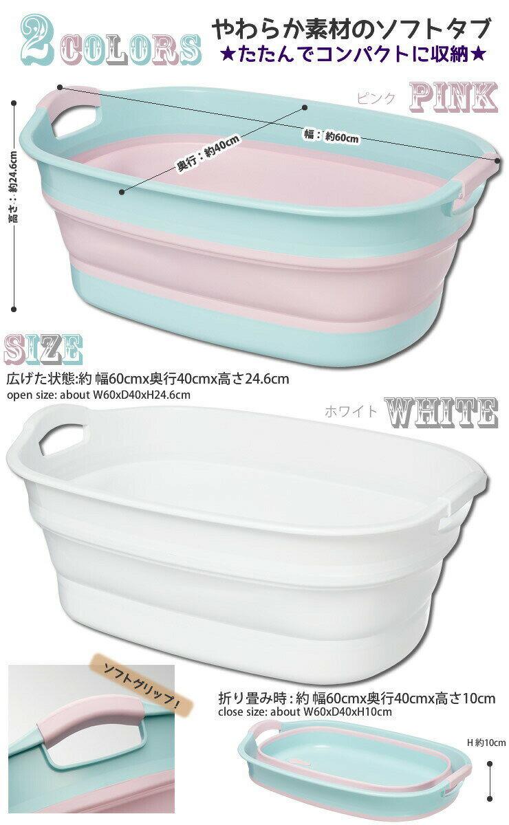 ソフトタブワイド (SOFT TUB WIDE) / ISETO 伊勢藤 仕様 サイズ:約幅60cmx奥行40cmx高さ24.6〜10cm 耐熱温度:約100度から-20度 材 質:本体・取手・滑り止め・水抜き栓:熱可塑性エラストマー/枠・底:ポリプロピレン 原産国:日本製 ※WEB上のため、実物と画像とで色など、多少違う点がございますのでご理解ください。 ※商品仕様・サイズ等は変更する場合があります。 ※ご注文日より通常5営業日以内に発送(土日祝日を除く)となります。 商品の特徴 やわらか素材のソフトタブ・ワイド。使用後は折りたたんでコンパクトに収納 ペットバスに、大きな野菜や果物を洗うのに、お子様の水遊びに、洗濯カゴ、つけ置き洗いに。 水切りもラクラク!便利な水抜き栓付き。滑りにくいエラストマーの取手。底面には滑り止め付き。 かさばりがちな大きなたらいが、おしゃれで、コンパクトに収納できます! Made of soft material Folds up after use for compact storage. ISETO 伊勢藤 折り畳みバケツ 折りたたみバケツ ソフトタブ SOFT TUB 折りたたみ バケツ ペットのお風呂 防災 シリコンバケツ のびのびカラフルたらい おしゃれ シンプル ナチュラル 北欧 セレブ 収納上手 季節の贈り物に 父の日 母の日 敬老の日 孫の日 御中元 敬老の日 ハロウイン クリスマス 冬ギフト お歳暮 お年賀 お正月 年末年始 バレンタイン ホワイトデー 日々の心づかい、ちょっとした手みやげに 御祝 御礼 御挨拶 粗品 お使い物 贈答品 ギフト プレゼント お土産 手土産 贈りもの 進物 お返し お祝いや内祝いなど祝儀の品に 引き出物 お祝い 内祝い 結婚祝い 出産祝い 引き菓子 快気祝い プチギフト お誕生日 七五三 進学内祝 入学内祝やわらか素材のソフトタブ・ワイド。折りたたみタブのパイオニア伊勢藤(iseto)。 折りたたんで厚さたったの約10cm。折りたたみ部分も丈夫な日本製で安心。 簡単で美しい曲線美。水を貼ることもできるので水遊びや洗濯、飲み物や食品をを冷やすバスケットにも使用できます。 便利な水抜き栓つき、傾けて流すこともでき、かんたん収納できるお手軽で便利なタブ(たらい)です。 →シリーズはこちらから
