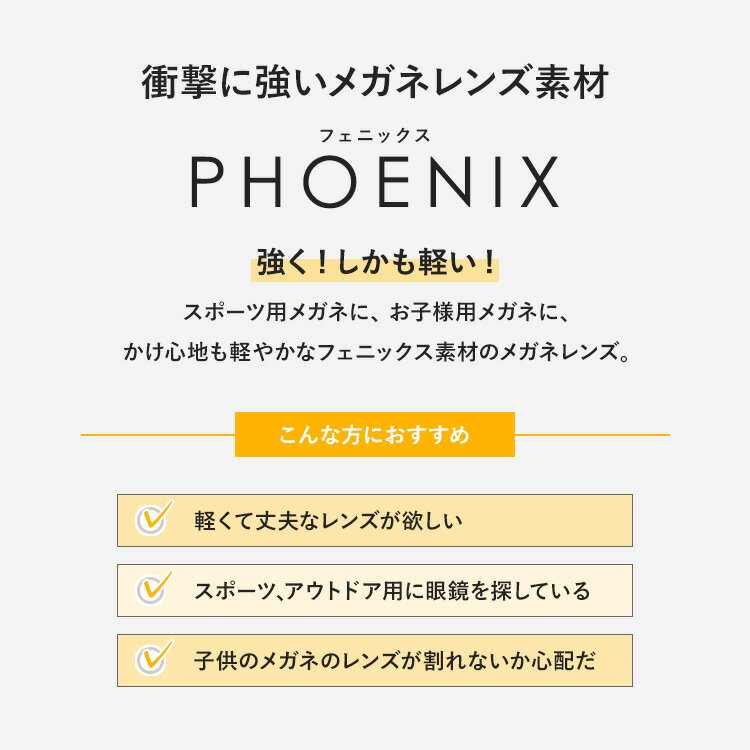 ※作成する度数またはお選び頂く選択肢によっては更に納期をいただく場合がございます。他店で購入した眼鏡でもOK!お手持ちの眼鏡やサングラスのレンズ交換承ります!レンズやオプション(カラーやミラーコート)をご購入の上、当店までフレームをご送付ください。なお、度数・フレームのデザインや状態等によっては承りかねますことご了承ください。▼必ず下記の注意事項をご一読くださいますようお願い致します。1.レンズ交換のみの場合、往復の送料はお客様負担となります。※出来上がったお品物をお届けの際の送料はご注文時に加算されておりますため、戻し伝票等のご用意は不要です。2.度数やフレームの形状によっては、加工が出来ない場合がございます。※眼鏡をお送りいただいても度数やフレームの形状によりレンズ交換をお断りさせていただくことがございます。最終的な判断は実際にフレームを拝見してからさせていただきますが、事前にメールやお電話にてご相談ください。3.配送中にフレームが破損などした場合の一切の保証は致しかねます。※眼鏡は衝撃に弱いため、レターパックや封筒での発送はご遠慮下さい。丈夫なケースや箱に入れて発送くださいますようお願い致します。4.ツーポイントや特殊なフレーム、劣化が激しいフレームなどの加工は承りかねます。5.コンタクトレンズの度数ではお作り出来ません。メーカーHOYA(ホヤ)型番ハイルックス フェニックスHL153VS素材プラスチック仕様球面 1.53 度付きレンズ反射防止コート水やけ防止撥水コートUVカット(99%以上)度数対応範囲詳しい対応範囲は、画像をご確認ください。※対応範囲外の度数につきましては別途特注費(+3,300円)が必要となります。備考・衝撃に強いレンズで割れにくい。・お子様メガネに、スポーツメガネ(プロギア等)におすすめレンズ・『カラー染色オプション』『ミラーコートオプション』は対応いたしておりません。※こちらの商品は、ご購入後の返品・交換は承れません。レンズ交換についての詳細夏だけでなく、一年中容赦なく私たちの体に降り注ぐ紫外線。日焼け止めを塗ったり、帽子をかぶったり、UVカット素材の服を着たり、日焼け予防のUVケアは気が抜けません。しかし、お肌をガードしていても肌が黒くなってしまうことがあります。それは、目から入る紫外線が原因になっているのです!肌を黒くするメラニン色素は、目から「紫外線が当たった」という情報を受け、脳がそれを認識することによっても生成されてしまいます。目を日焼けから守る一番のアイテムは、アイウェア。当店取り扱いのアイウェアのレンズには、伊達メガネ・サングラスともにUVカットレンズを使用しており、機能面も充実しております。UVカットサングラス 全商品UVカット率99%レンズを使用しております。UVカット効果があると共に屋内でも掛けやすいサングラスやトレンドのメガネフレームを多く取り揃えております。いつもの紫外線対策アイテムに、今年はぜひサングラス・メガネも加えてみてはいかがでしょうか?