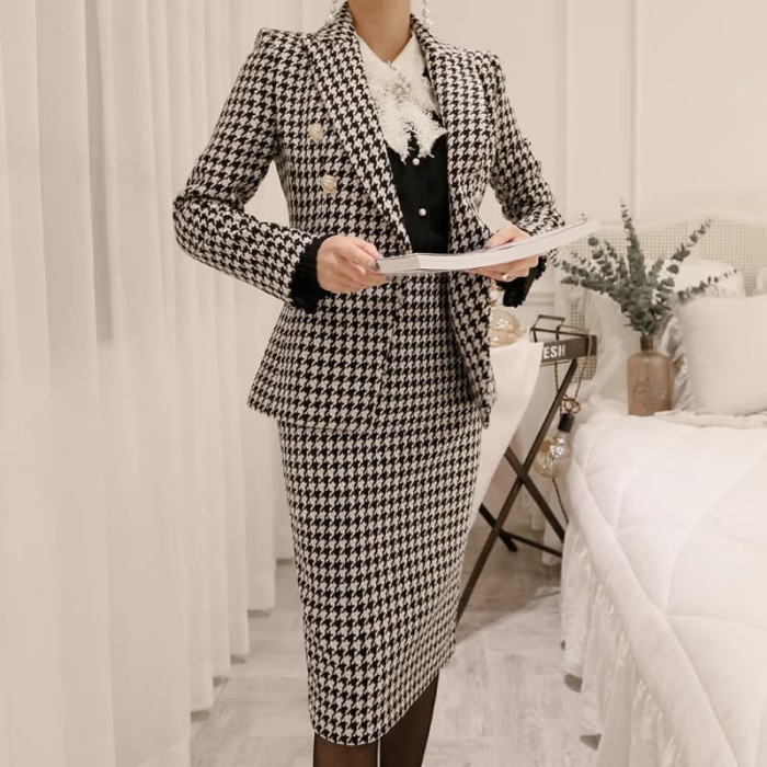 スカートセットアップ テーラードカラー 千鳥格子柄 長袖 ジャケット タイト ミモレ スカート スーツ 黒 セットアップ お嬢様 大きいサイズ 上品 着痩せ 小顔 おしゃれ カジュアル 結婚式 レディース フォーマル 体型カバー きれいめ 大人 お呼ばれ