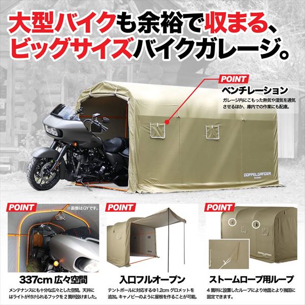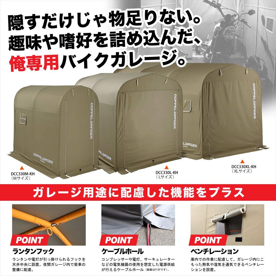 【送料無料】【ドッペルギャンガー】 【4589946142457】バイク用 ストレージバイクガレージ(カーキ) XLサイズ 屋外簡易車庫 全長337cm ウルトラ級大型バイク格納 DCC330XL-KH【組立簡単!好評につきXLサイズ登場】※※こちらの商品はメーカー直送販売の都合上、代引・日時指定はお受けできません。※北海道は、別途送料がかかります。予めご了承ください。組立簡単!好評のバイクガレージにXLサイズ登場!!自分専用ガレージが簡単にもてます。サイズ:W160×L(D)337×H170cm、重量:20.5kg■普通のサイズじゃ物足りない。趣味も嗜好もすべて収める、ビッグサイズの俺専用ガレージハウス。車体全長の長い大型バイクを収納できるビッグサイズの簡易ガレージ。特別な工具を必要としないカンタン組立はそのままに、さらにユーザビリティを向上した簡易ガレージハウスです。●大型バイクも収納できるビッグサイズ・ストレージバイクガレージXLの全長は337cm。車体全長が長く、これまでの簡易ガレージでは収納できなかった大型バイクも容易に収納することが可能です。空間が広いので、バイクの収納に限らず、バイクガレージ内でのメンテナンスやメンテナンス用品の保管もできます。●入り口をフルオープンできるスクリーングロメット・バイクガレージは設置する場所によっては湿度が大きく変化し、結露などが発生する場合があります。ストレージバイクガレージXLはガレージ内の換気効率を最大化するため、入り口部分にテントポールに対応するΦ1.2cmグロメットを追加しました。換気効率の改善に限らず、キャノピーのように広げることで入口部分にちょっとした屋根を作ることもでき、前後フルオープンも可能です。※本製品にテントポールは付属していません。●より使いやすいバイクガレージを目指した追加仕様・入り口を巻き取りやすくするPEボード、地面との固定力を強化するストームロープ用ループ、内側からの開閉を可能にするダブルサイドファスナーと、さまざまな工夫が施されています。●ガレージ用途に配慮したプラス機能・ケーブルホールコンプレッサーや電灯、サーキュレーターなどの庫内への電源供給に対応します。・ベンチレーションガレージ内にこもった熱気や湿気を通気させるほか、庫内での作業にも配慮しました。・ランタンフックランタンや電灯が引っ掛けられるフックを設置。夜間ガレージ内で愛車の整備に便利です。●工具不要、かんたん組み立て・工具を使わず、かんたんに設営できます。ポールに記載の番号を参考につなぎ合わせてタープ生地をかぶせ、固定するだけで設営完了です。●前後ドア開閉・密閉された内部ではメッシュウィンドウのみでは効率的に空気が循環しない可能性があります。そのため前後 開閉できる事で、短時間での換気が可能です。●製品ディティール・視認性の高いカラーフレーム・メッシュポケット2箇所・簡易ロック用アイレット・常設用ペグ4本付属【コンセプト】「ストレージバイクガレージ XLサイズ」はシリーズ最大級の全長337cmでウルトラ級大型バイクの収納を可能にしました。グロメットを利用したキャノピー仕様にもなり、今までにない広いスペースで、愛車を保管し快適に過ごすスペ ースを作り出します。 サイズ:W160×L(D)337×H170cm、重量:20.5kg材質:生地:ポリエステル、フレーム:スチール パイプ径:20mm、組立て推奨人数:2人以上、組立目安時間:60分 別途用意が必要な工具:ゴムハンマー 製品特徴: 大型バイクも収納できる全長337cm、バイクの収納やバイクガレージ内でのメンテナンス、メンテナンス用品の保管も可能。入り口をフルオープンのキャノピー仕様にできる直径1.2cmのスクリーングロメット、入り口を巻きやすいPEボード、地面との固定を強化するストームロープ用ループ、内側からの開閉可能なダブルサイドファスナー、ケーブルホール、ベンチレーション、ランタンフック付き。 製品の詳細や最新情報はメーカーホームページをご確認下さい。 製品改良などを目的として予告なしに仕様を変更する場合があります。 製品につきましては細心の品質管理を行っておりますが、万一製品に不具合・不足部品等がございましたら、取扱説明書に記載のメーカーサポート窓口までお問い合わせ下さい。商品の詳細な情報については、メーカーサイトでご確認ください。商品及び品番は予告なく変更が行われる事がございます。【ご注文の際の注意事項】●適合・取付・ご使用は、お客様にて判断の上お願い致します。●品切・完売の場合がございますので、受注後に発送予定をご連絡させて頂きます。●画像はイメージとなりますので商品とは色・デザインが異なる場合があります。 ●商品ご到着時に必ず製品に不具合が無いか確認を行ってください。 配送時の破損や製品不具合の場合は、必ず商品ご到着より3日以内にご連絡お願い致します。それ以降にご連絡頂いた場合はご対応出来ない場合がございます。●当店では、商品不良・誤商品発送以
