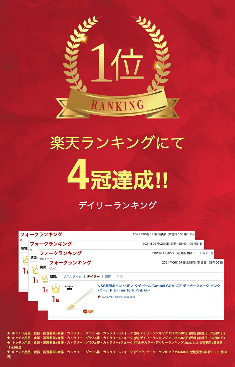 関連商品クチポール Cutipol GOA ゴア デザートフォーク レッド×ゴ...山崎実業 TOWER タワー 折り畳み高床式ランドリーバスケット タワ...1,999円7,700円クチポール Cutipol GOA ゴア ディナーフォーク レッド×ゴ...クチポール Cutipol GOA ゴア デザートフォーク ピンク×ゴ...1,899円2,499円クチポール Cutipol GOA ゴア デザートフォーク ブルー×ゴ...クチポール Cutipol GOA ゴア デザートフォーク グレー×ゴ...1,899円1,899円山崎実業 TOWER タワー つっぱり棚 伸縮 つっぱり棒用棚板 L ...クチポール Cutipol GOA ゴア ディナーフォーク グレー D...3,300円1,599円クチポール Cutipol GOA ゴア デザートスプーン ピンク×ゴ...山崎実業 TOWER タワー 密閉米びつ 10kg 計量カップ付 タワ...1,999円3,960円商品名クチポール【Cutipol】GOA (ゴア) ディナーフォーク Dinner forkカラーピンク×ゴールドサイズ長さ約22cm素材ステンレス、レジン(合成樹脂)商品について【ディナーフォーク】クチポールの伝統を受け継ぐ熟練職人によって手作業で作られるカトラリーは、温かみを感じさせてくれます。とても軽く、人間工学に基づいてひとつずつ作られているので手にしっくりなじみます。力をいれなくてもしっかりと刺すことができる刃先なので抜群の使いやすさ。人気シリーズGOAのディナーフォークです。ご注意<クチポールの製品に関しまして>職人によって1点1点手作りにて生産されているため、サイズや形状に個体差が見られる場合がございます。また製造工程や素材の特性上、金属のくすみ、木製の柄の色合いの違い、微細な傷などが見られる場合がございます。あらかじめご了承の上お買い求めくださいませ。<メンテナンス方法について>GOAは製作の工程において、仕上げとして磨きをかけています。未使用時は柄の樹脂の色が少し白みを帯びた状態ですが、ご使用される中で色は少しずつ濃くなります。特に濃色製品(ブラック、ブルー、ブラウン、レッド)はオリーブオイル等を布に染み込ませ、柄を磨いていただくと色が鮮やかになり退色も防ぐことが可能です。ブランド【Cutipol(クチポール)】スプーンやフォークなどのカトラリーで人気を集めているポルトガルのクチポール。職人の手でひとつひとつ手作りし、デザインはもちろん製造工程も自社で管理するこだわりを持つブランドです。また、それぞれの地域に向けた商品を作っており、日本向けにはニーズに合った少し小さなサイズをデザインしています。当初は家族経営の小さなメーカーでしたが、現在ではヨーロッパをはじめ世界中で愛されるブランドに成長しました。※海外正規品を直輸入している並行輸入品です。※画像や説明に記載のカラーやサイズが選択欄にない場合、そちらの商品は現在取り扱っておりません。※ご購入に関するご案内【あす楽年中無休関東】【あす楽年中無休東北】【あす楽年中無休甲信越】【あす楽年中無休北陸】【あす楽年中無休東海】【あす楽年中無休近畿】【あす楽年中無休中国】【あす楽年中無休四国】【あす楽年中無休】【あす楽土曜営業】【あす楽_日曜営業】
